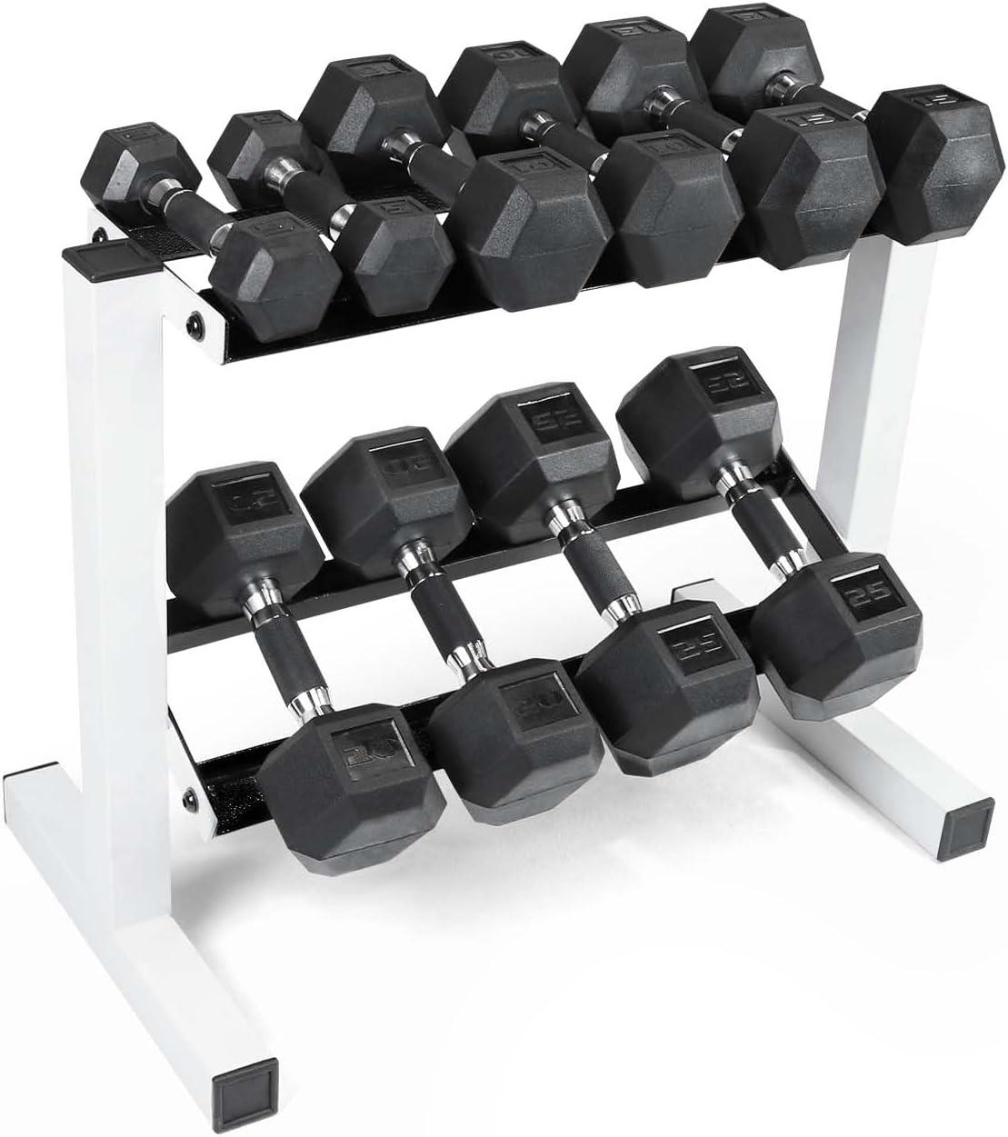 SET INCLUDES – A pair of 5-pound, 10-pound, 15-pound, 20-pound, and 25-pound rubber hex dumbbells with a black Two Tier dumbbell rack to store the weights. E-commerce packaging. This set ships in multiple boxes.