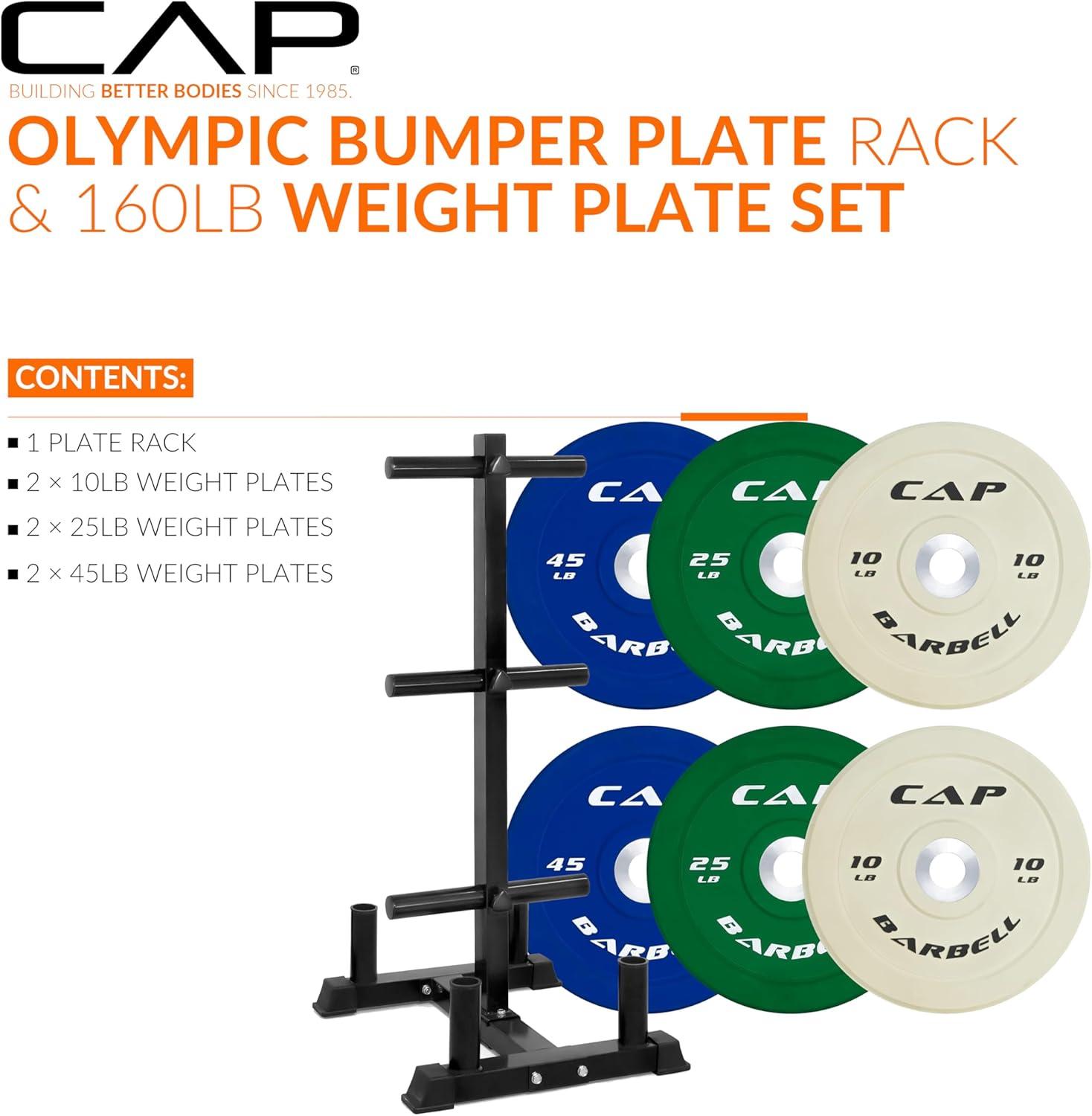 COMPLETE TRAINING BUNDLE – Get everything you need in one solution: Includes CAP Barbell Olympic Bumper Plate Tree Rack and a set of Competition Bumper Plates (10lb pair, 25lb pair and a 45lb pair ) Ships in multiple boxes, may arrive separately.