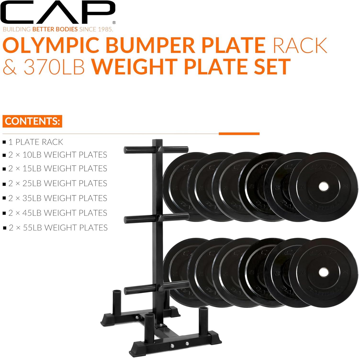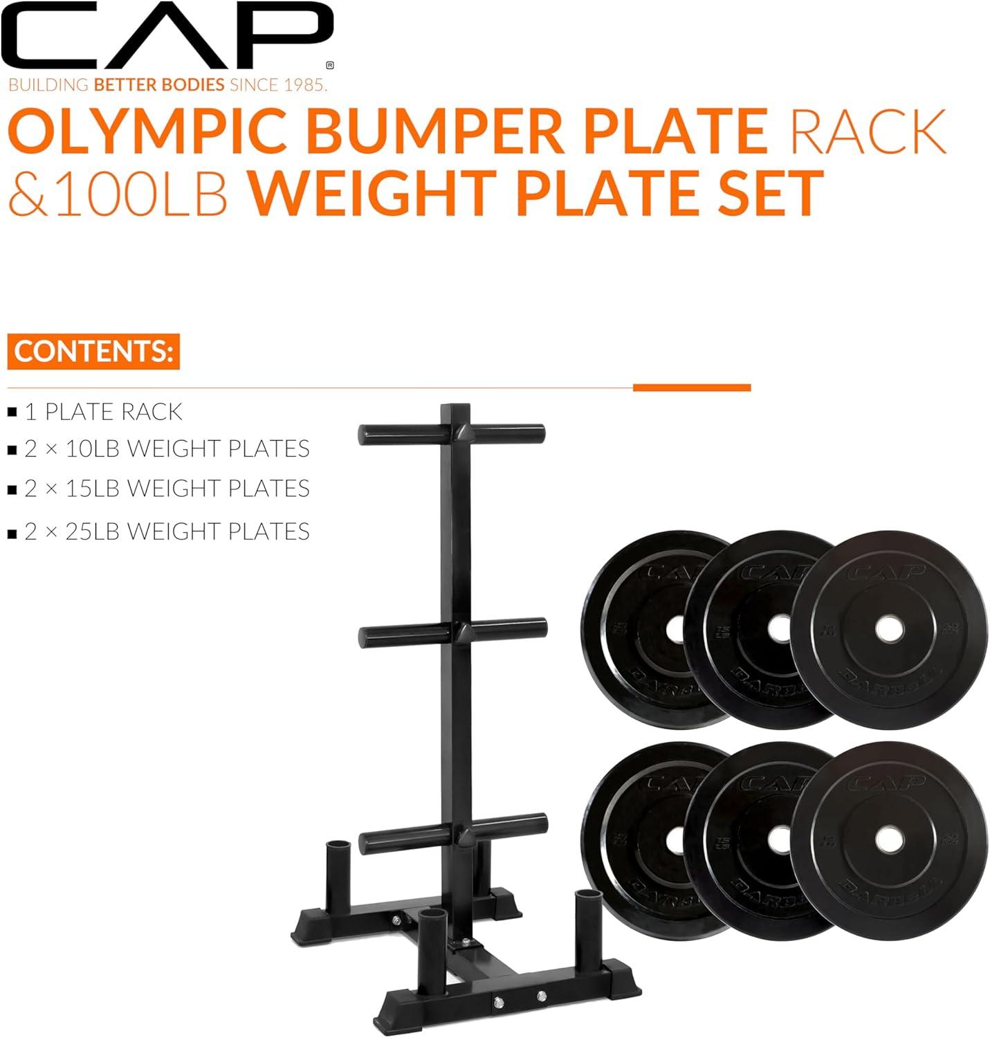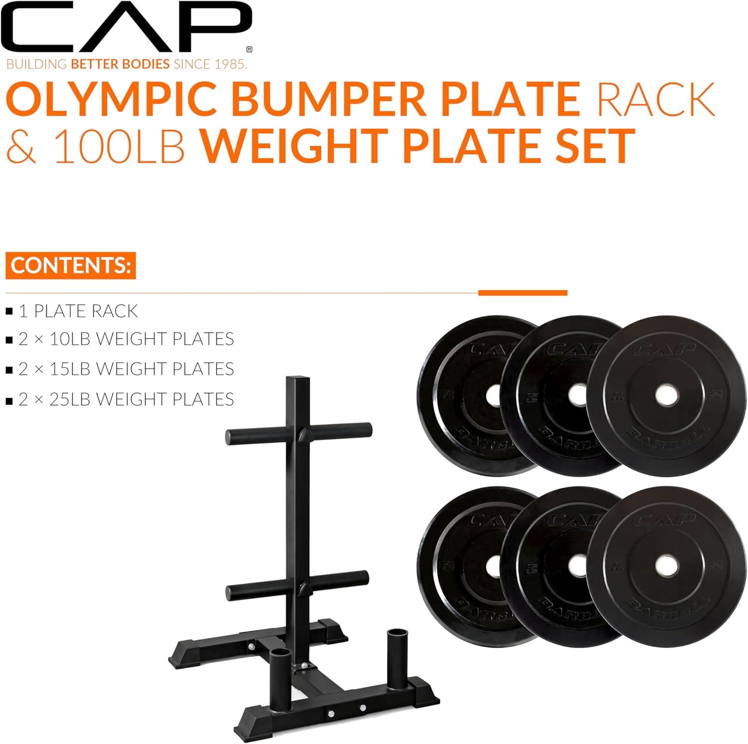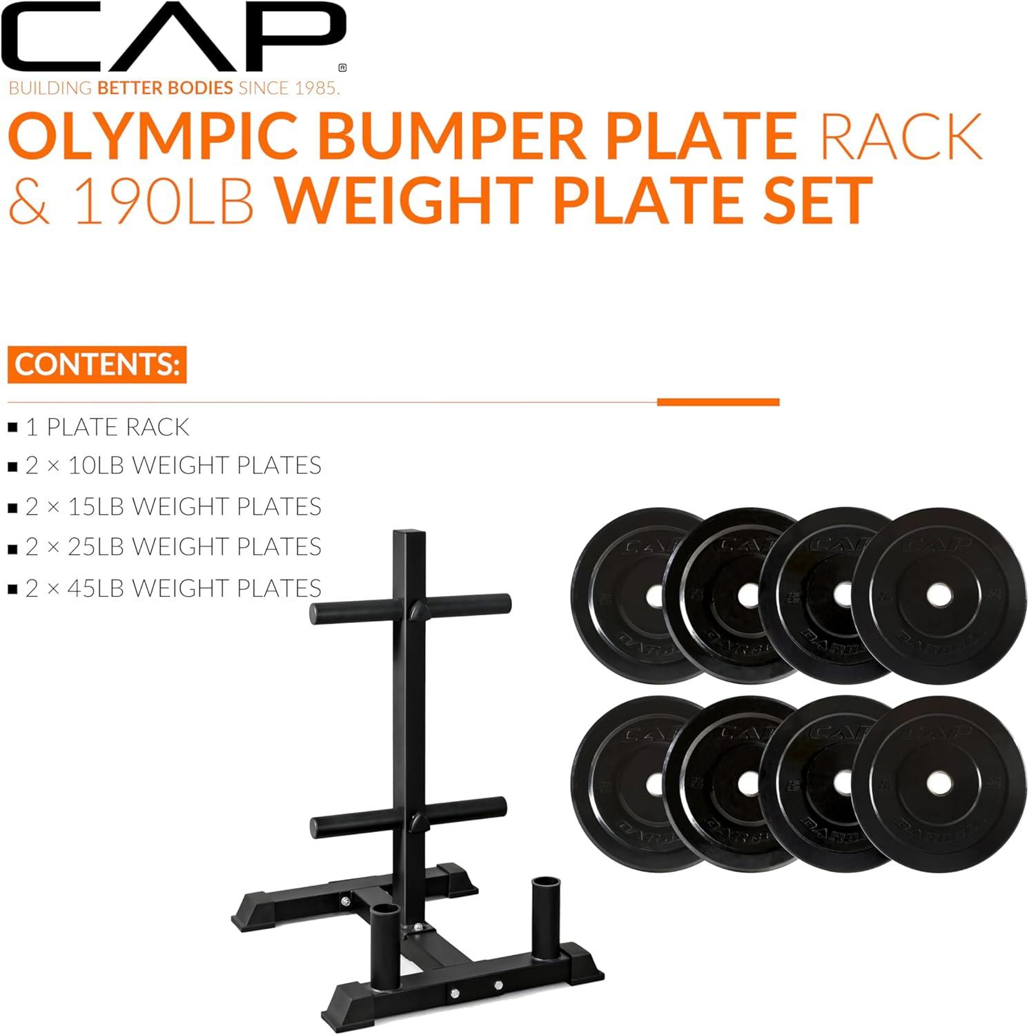 COMPLETE TRAINING BUNDLE – Get everything you need in one solution: Includes CAP Barbell Olympic Bumper Plate Tree Rack and a set of Competition Bumper Plates (10lb pair, 25lb pair and a 45lb pair ) Ships in multiple boxes, may arrive separately.
