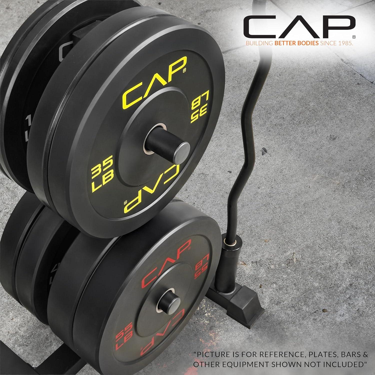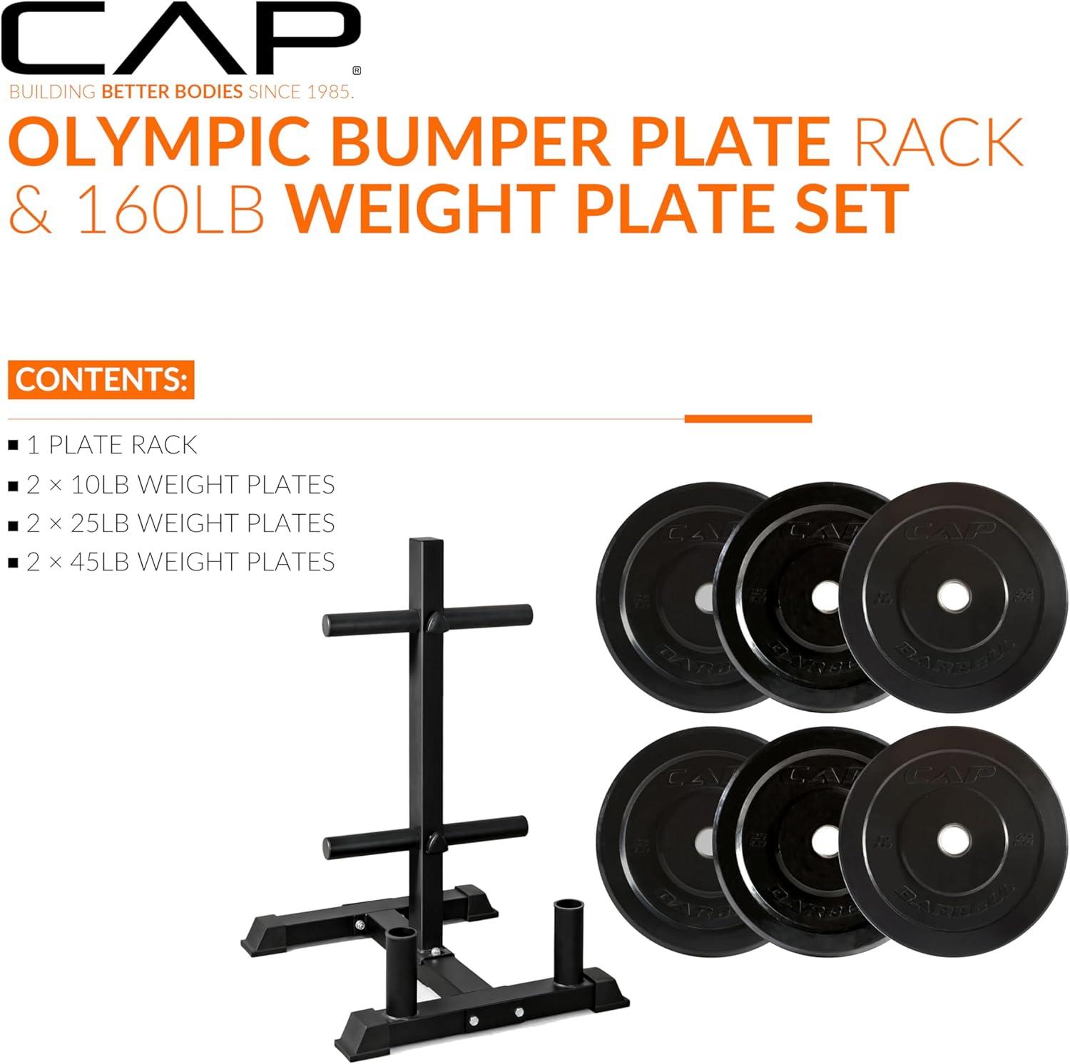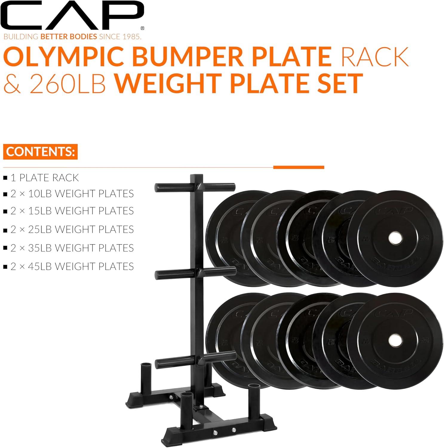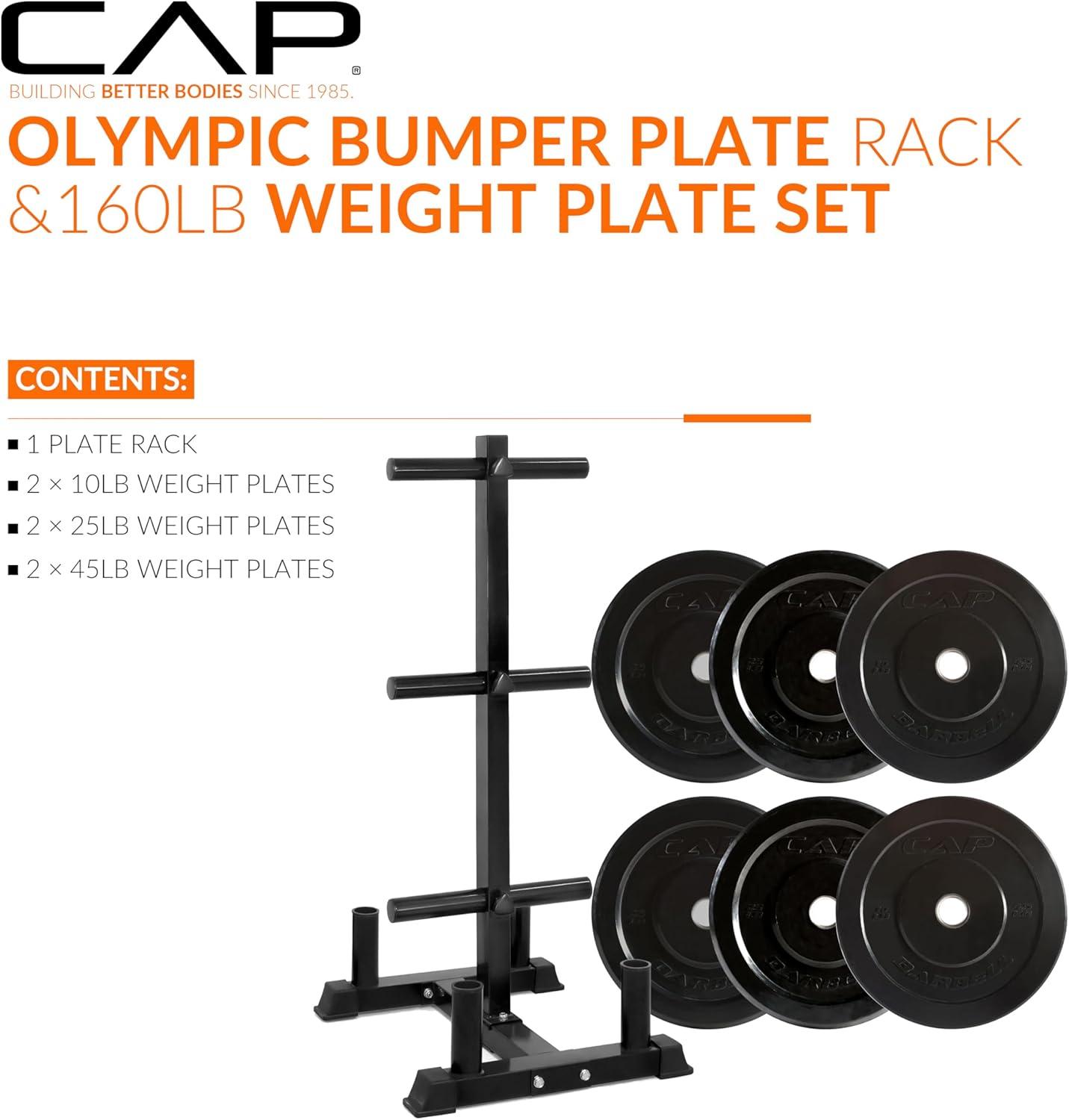 COMPLETE TRAINING BUNDLE – Get everything you need in one solution: Includes CAP Barbell Olympic Bumper Plate Tree Rack and a set of Competition Bumper Plates (10lb pair, 25lb pair and a 45lb pair ) Ships in multiple boxes, may arrive separately.