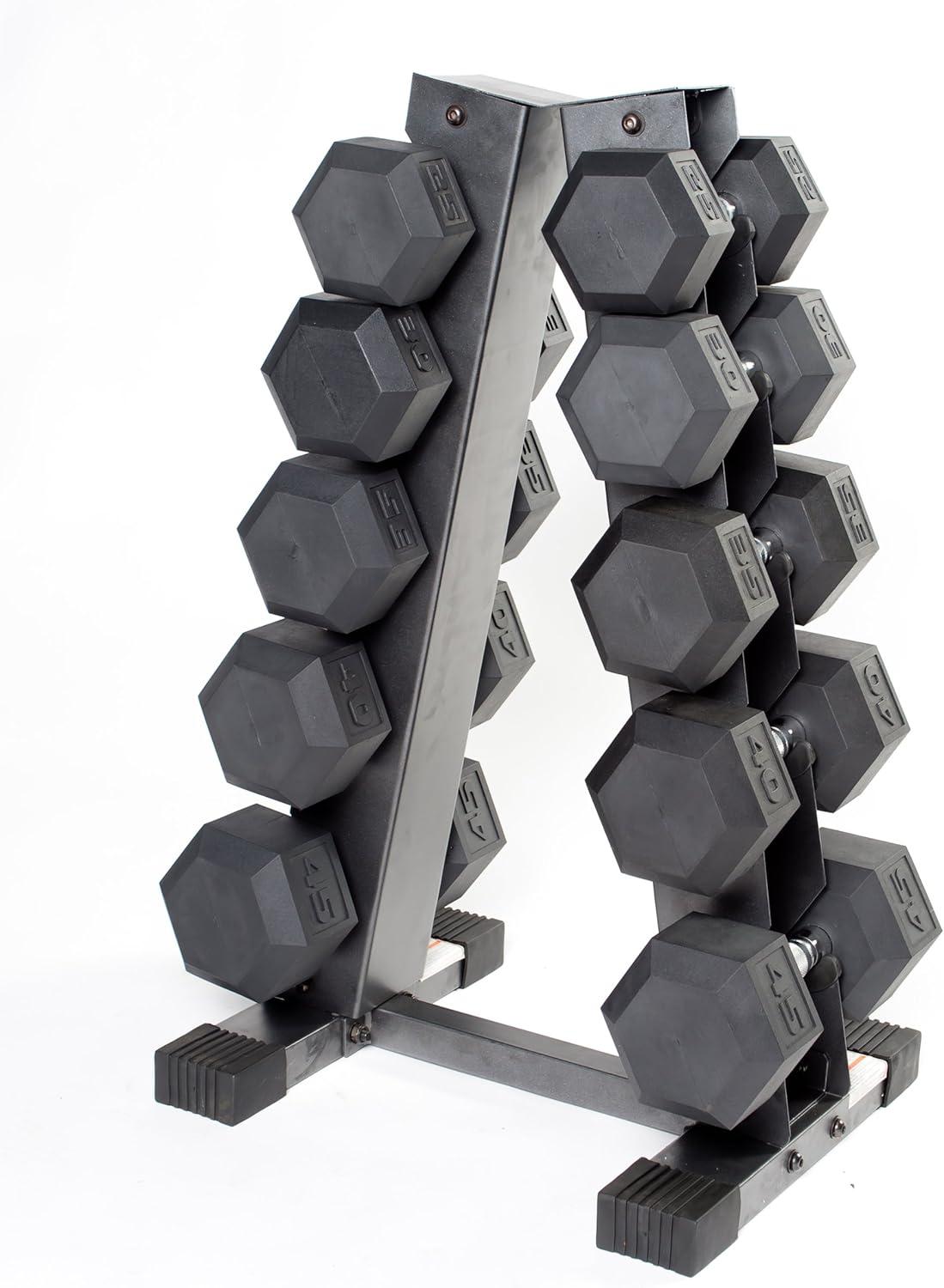 SPACE-SAVING DESIGN – Store FIVE pairs of dumbbells off the floor and neatly stack them on this rack; Designed to hold 10-30 pounds of CAP Rubber Hex or Hex dumbbells