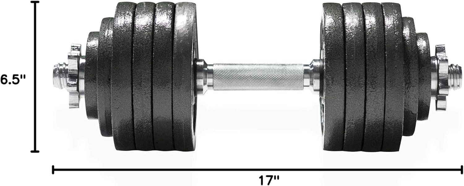 SET INCLUDES – A complete 52.5 lb adjustable dumbbell set featuring: one 17″ dumbbell handle, two 1.25 lb plates, two 2.5 lb plates, eight 5 lb plates, and two star-lock collars.