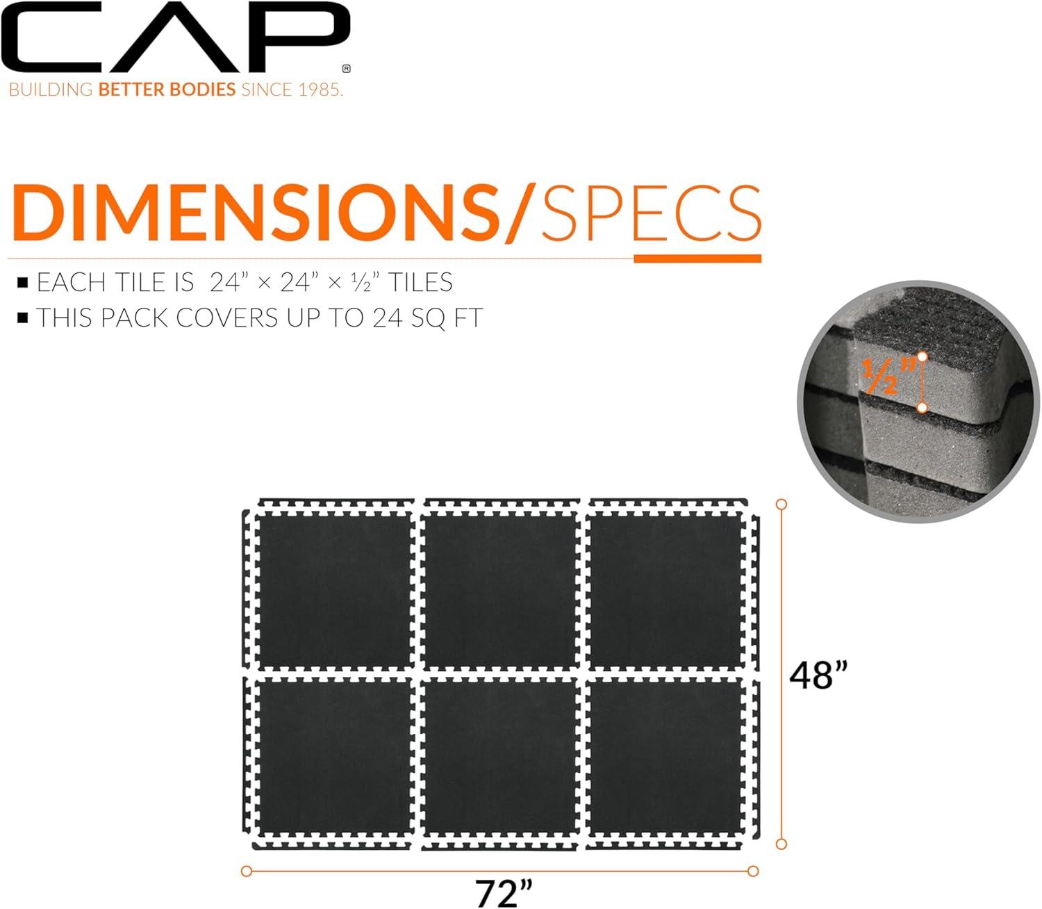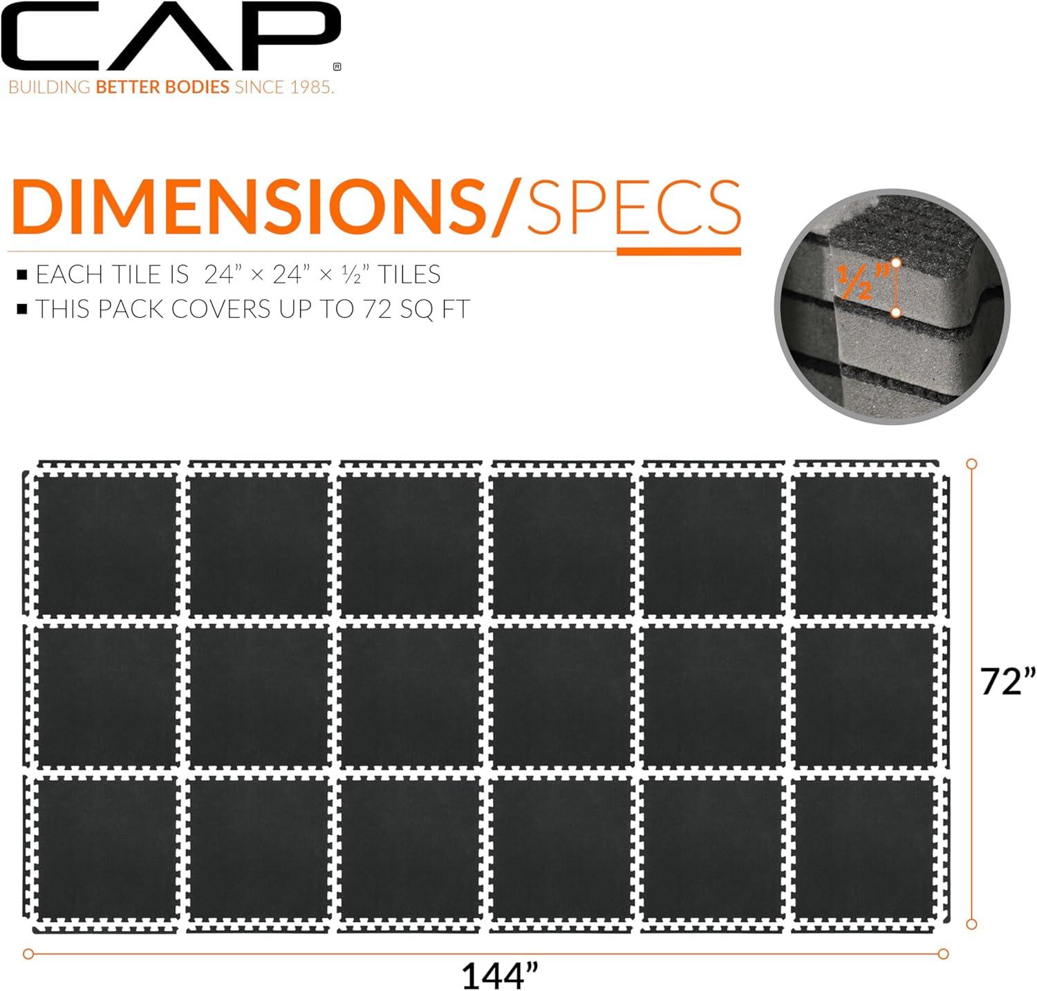 CAP Barbell Exercise Puzzle Mats: Your Ultimate Fitness Flooring Solution Elevate your workout experience with CAP Barbell’s Exercise Puzzle Mats, the perfect addition to any home gym or fitness space. Our premium foam mats feature an innovative interlocking design, making them easy to assemble and customize to fit any area. Crafted with high-density EVA foam, these puzzle mats offer exceptional shock absorption and a non-slip surface, ensuring safety and comfort during your most intense workouts. Whether you're practicing yoga, lifting weights, or engaging in high-impact exercises, these mats provide the reliable gym flooring you need. Designed for versatility, our mats are not only ideal for fitness enthusiasts. Their easy-to-clean surface ensures convenience and durability, making maintenance a breeze. Plus, their portable nature means you can easily move them to different locations or store them when not in use. With protective flooring qualities, CAP Barbell’s mats help reduce noise and protect your floors, adding extra comfort to your exercise routine. Embrace the multi-use functionality and experience the difference that CAP Barbell’s Exercise Puzzle Mats can make in your fitness journey. Transform your space with CAP Barbell—where quality and innovation meet for a superior workout experience.