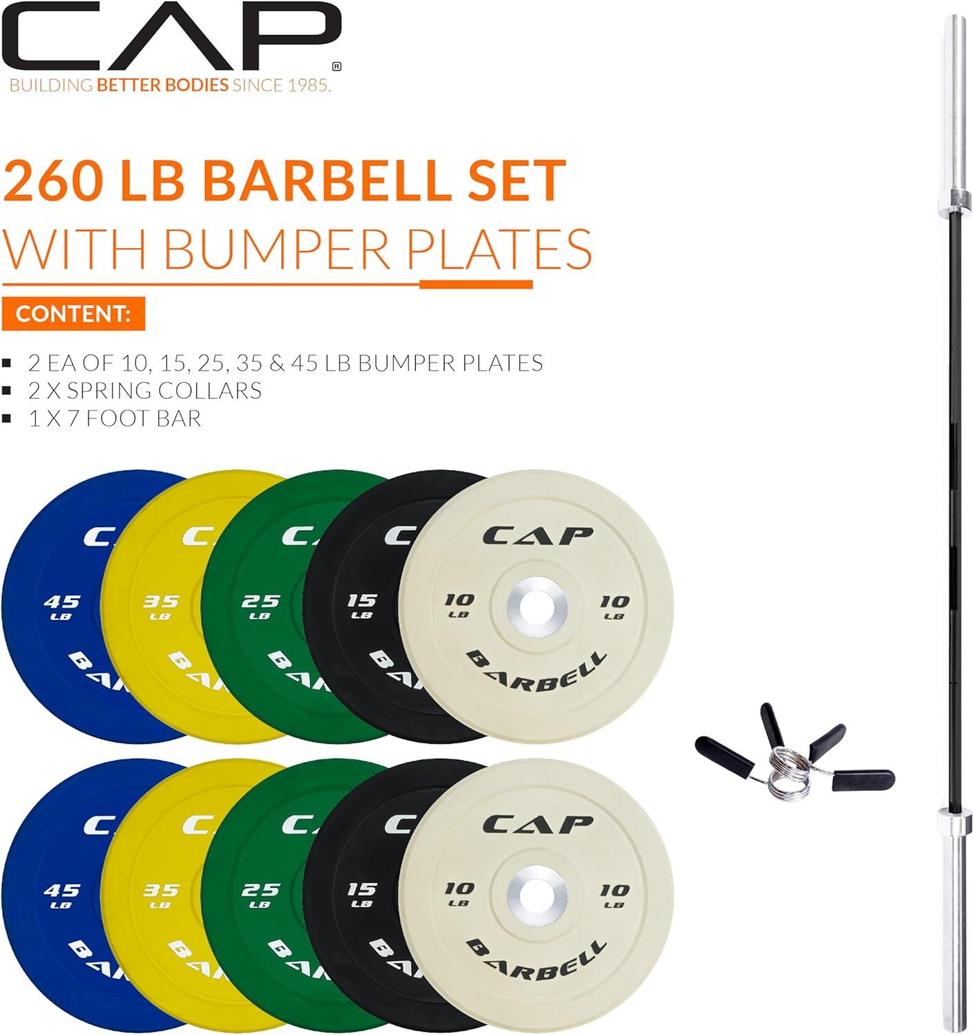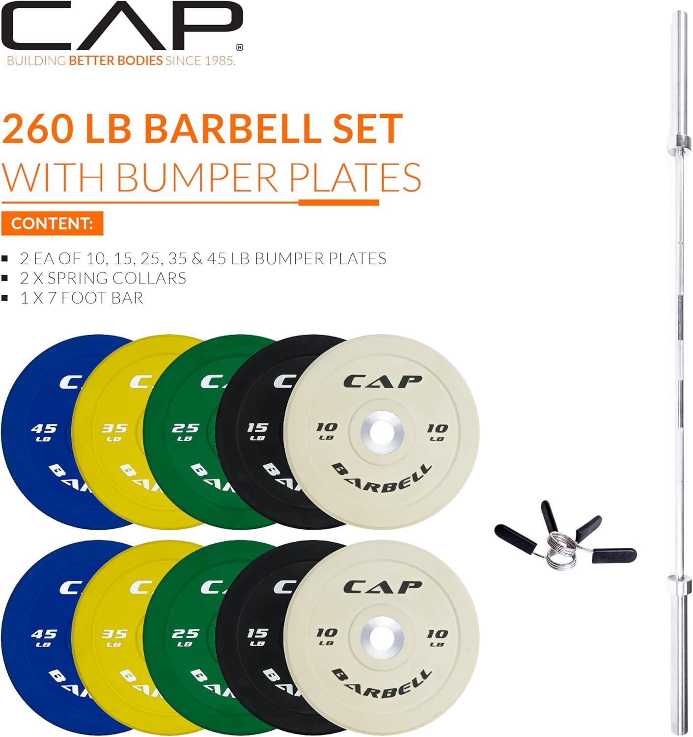 WHAT’S INCLUDED – Complete Olympic weight set with bar featuring one CAP Barbell 7ft Olympic barbell (20KG) and rubber Elite style bumper plates: 10 lb plates (pair), 15 lb plates (pair), 25 lb plates (pair), 35 lb plates (pair), 45 lb plates (pair), and 55 lb plates (pair); Designed for Olympic bars with a 2-inch diameter sleeve, 2 Olympic spring clip collars included