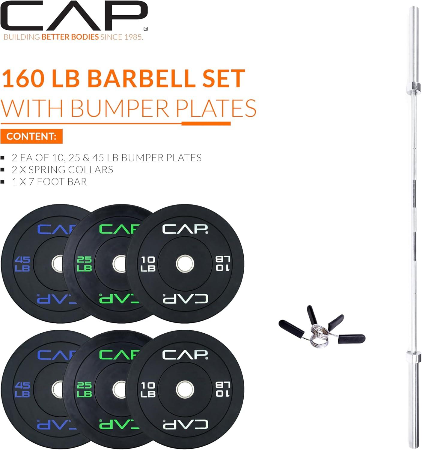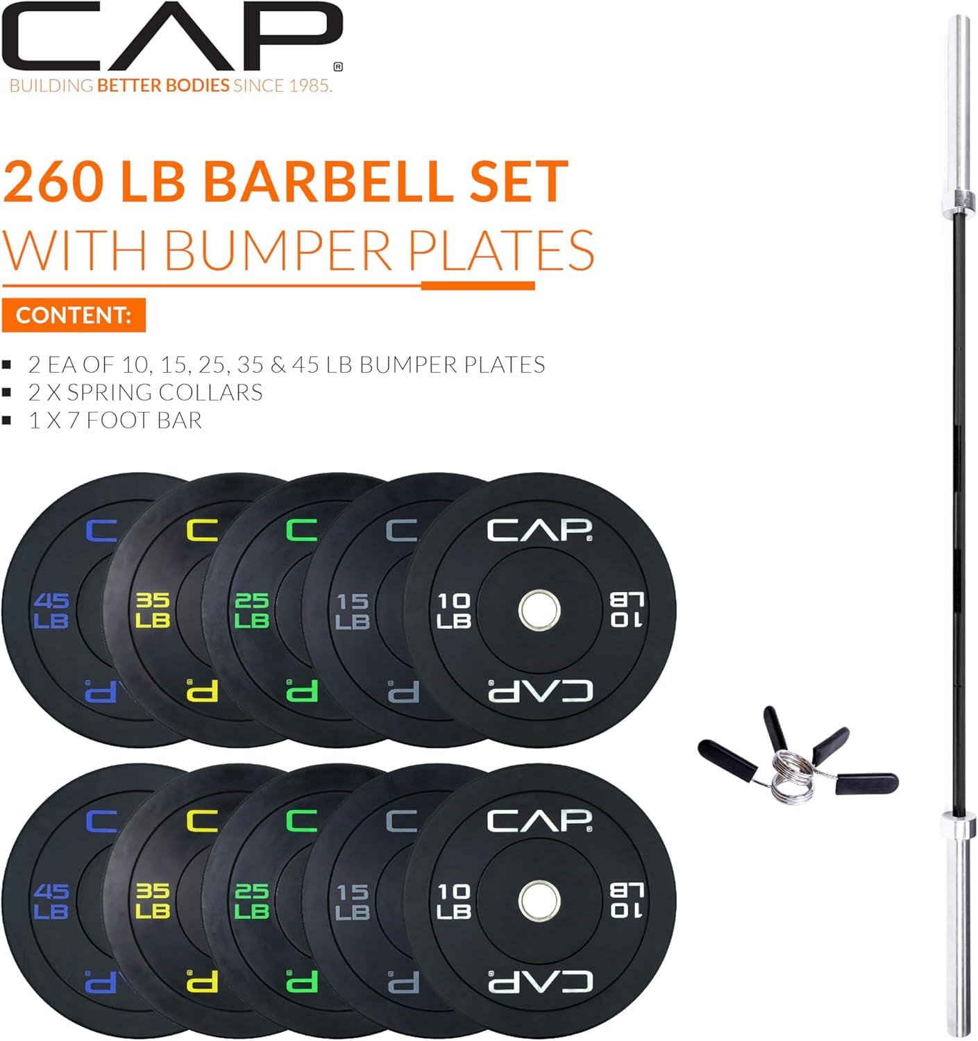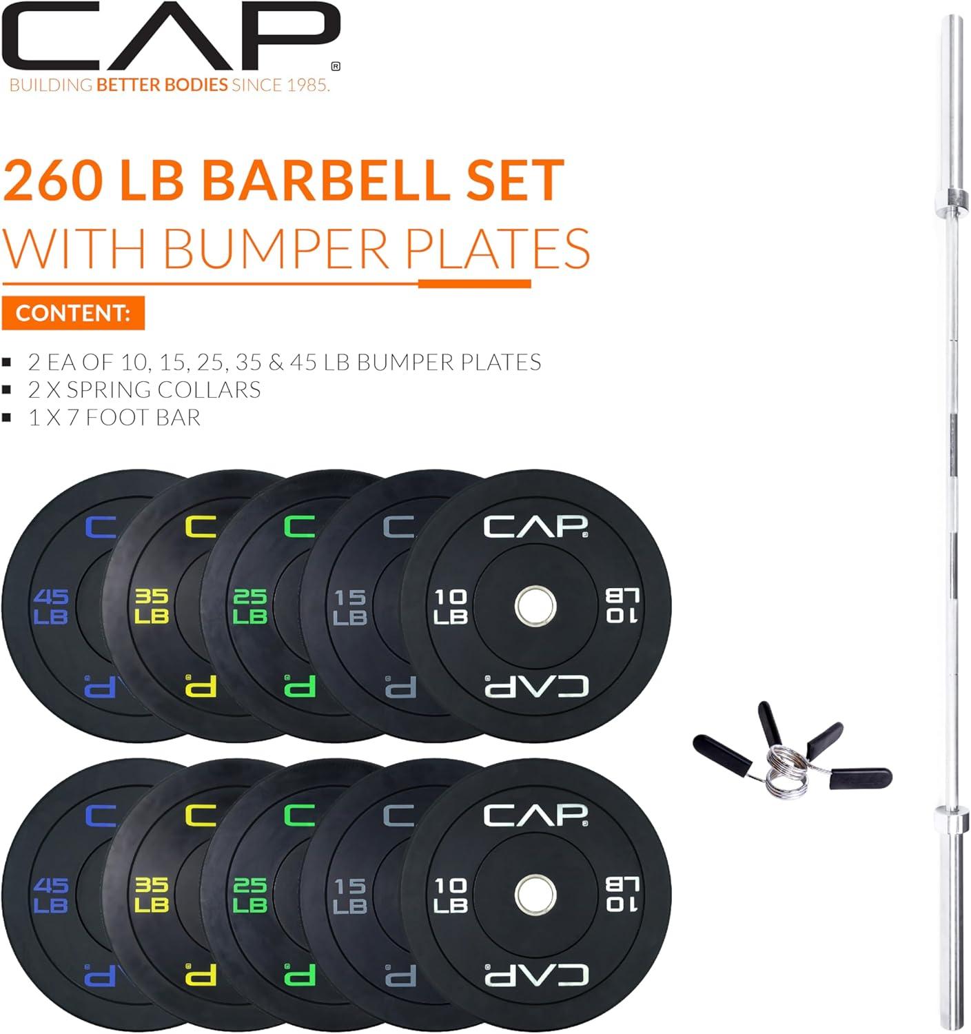 WHAT’S INCLUDED – Complete Olympic weight set with bar featuring one CAP Barbell 7ft Olympic barbell (20KG) and rubber Elite style bumper plates: 10 lb plates (pair), 15 lb plates (pair), 25 lb plates (pair), 35 lb plates (pair), 45 lb plates (pair), and 55 lb plates (pair); Designed for Olympic bars with a 2-inch diameter sleeve, 2 Olympic spring clip collars included