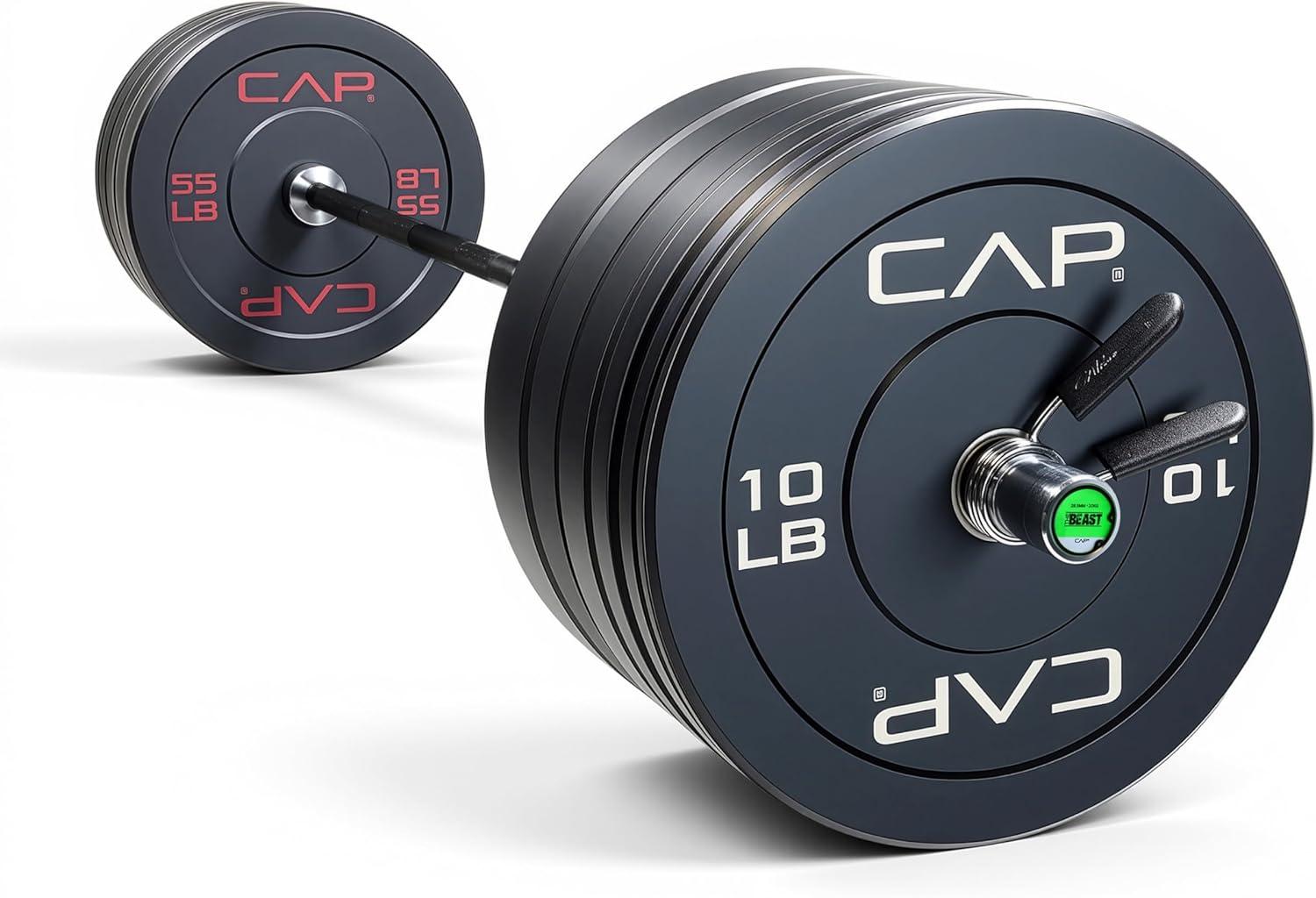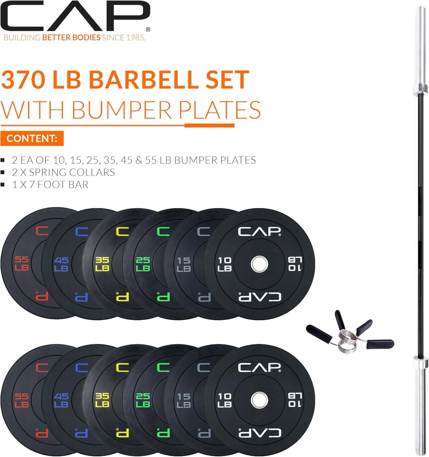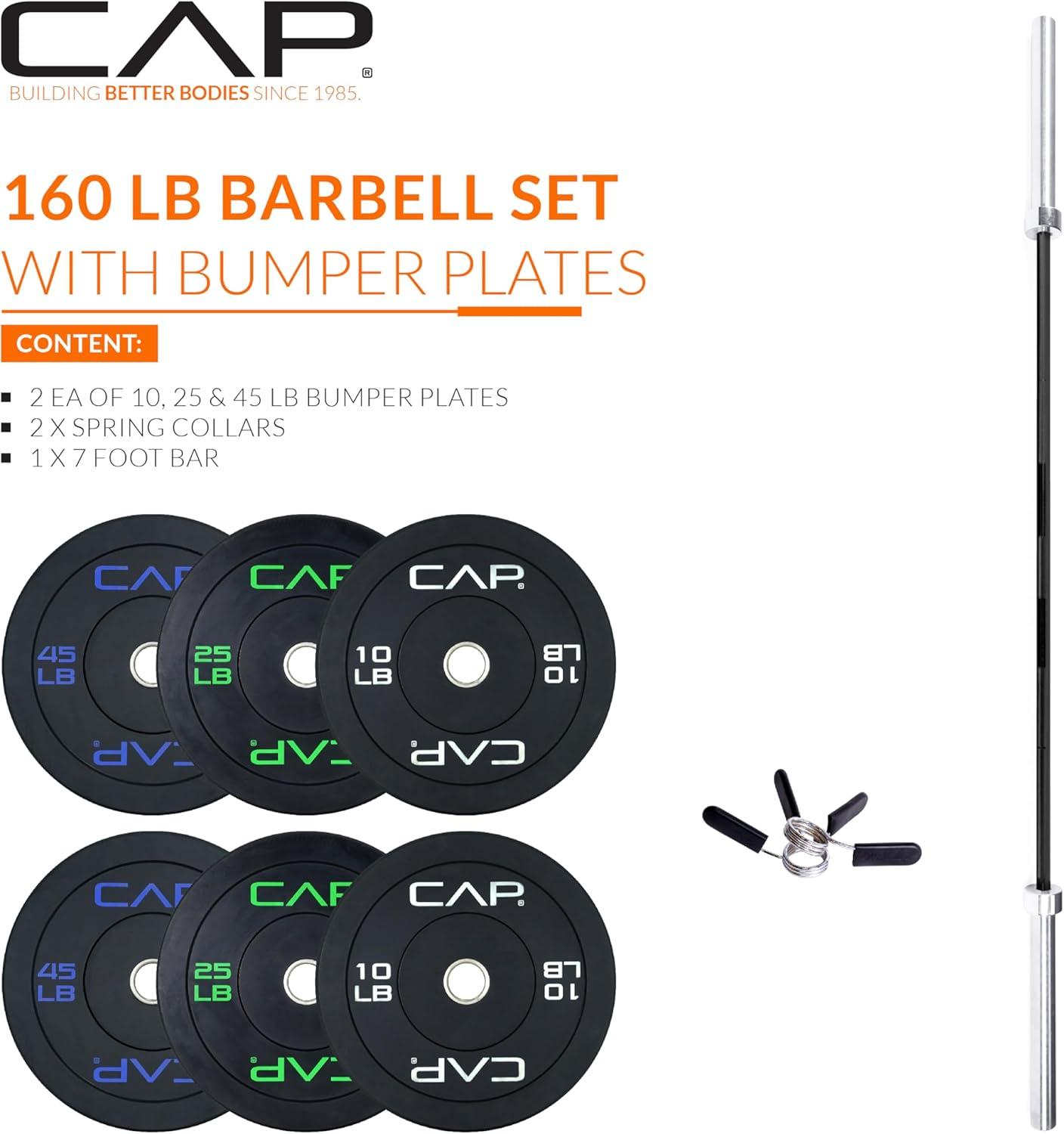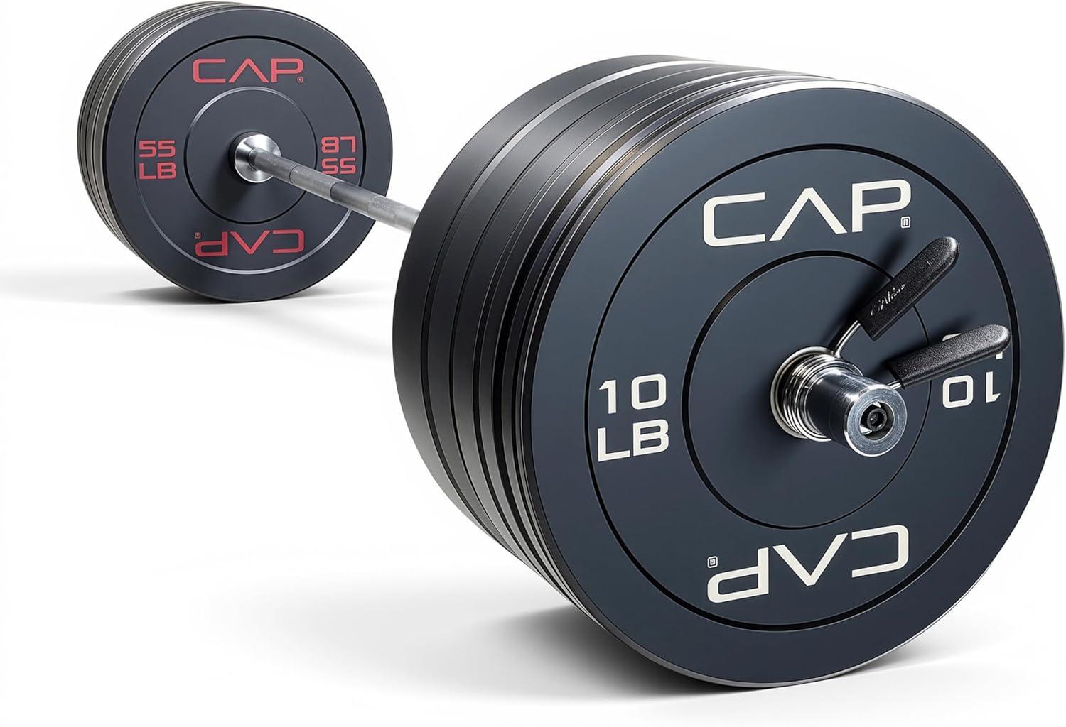 WHAT’S INCLUDED – Complete Olympic weight set with bar featuring one CAP Barbell 7ft Olympic barbell (20KG) and rubber Elite style bumper plates: 10 lb plates (pair), 15 lb plates (pair), 25 lb plates (pair), 35 lb plates (pair), 45 lb plates (pair), and 55 lb plates (pair); Designed for Olympic bars with a 2-inch diameter sleeve, 2 Olympic spring clip collars included