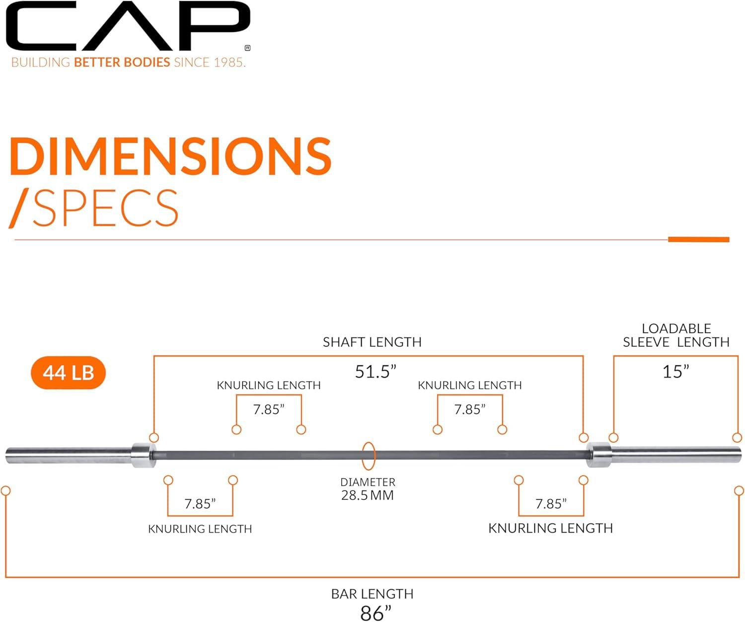 BARBELL CONSTRUCTION & SPECS – Japanese cold rolled steel Olympic bar with black phosphate finish & polished chrome sleeves; 110,000 PSI tensile strength; Weighs 44LB (20KG), Measures 7 feet long (2185mm) with a 28mm grip diameter; Loadable sleeve length of 15.3”; Supports up to 1200 lbs; Rotating sleeves reduce forearm strain during squats, bench press, and Olympic lifts