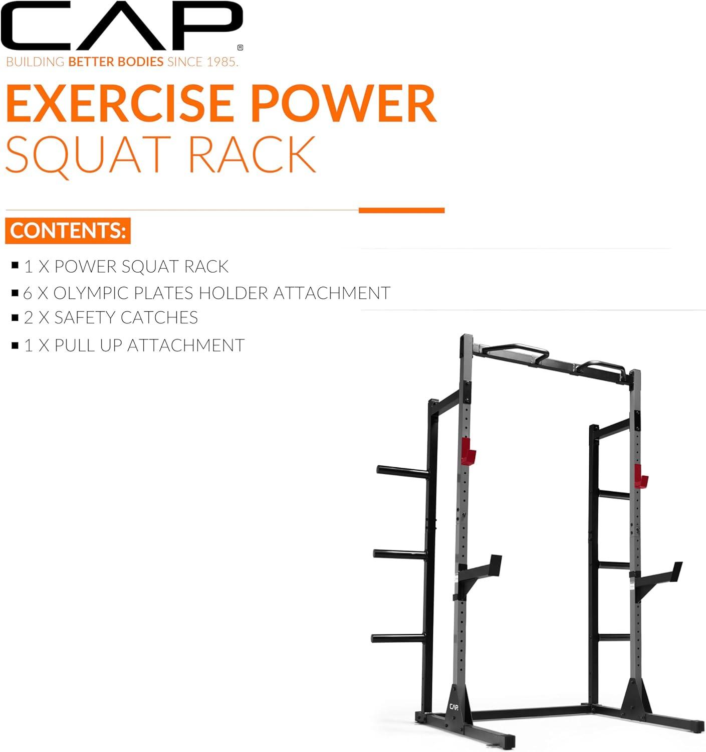 INCLUDED: 1 CAP Barbell Power Squat Rack, 6 Olympic Plate Holder Attachments, 2 Adjustable Safety Catches, and 1 Multi-Grip Pull-Up Bar. Everything you need for a complete power cage home gym setup.