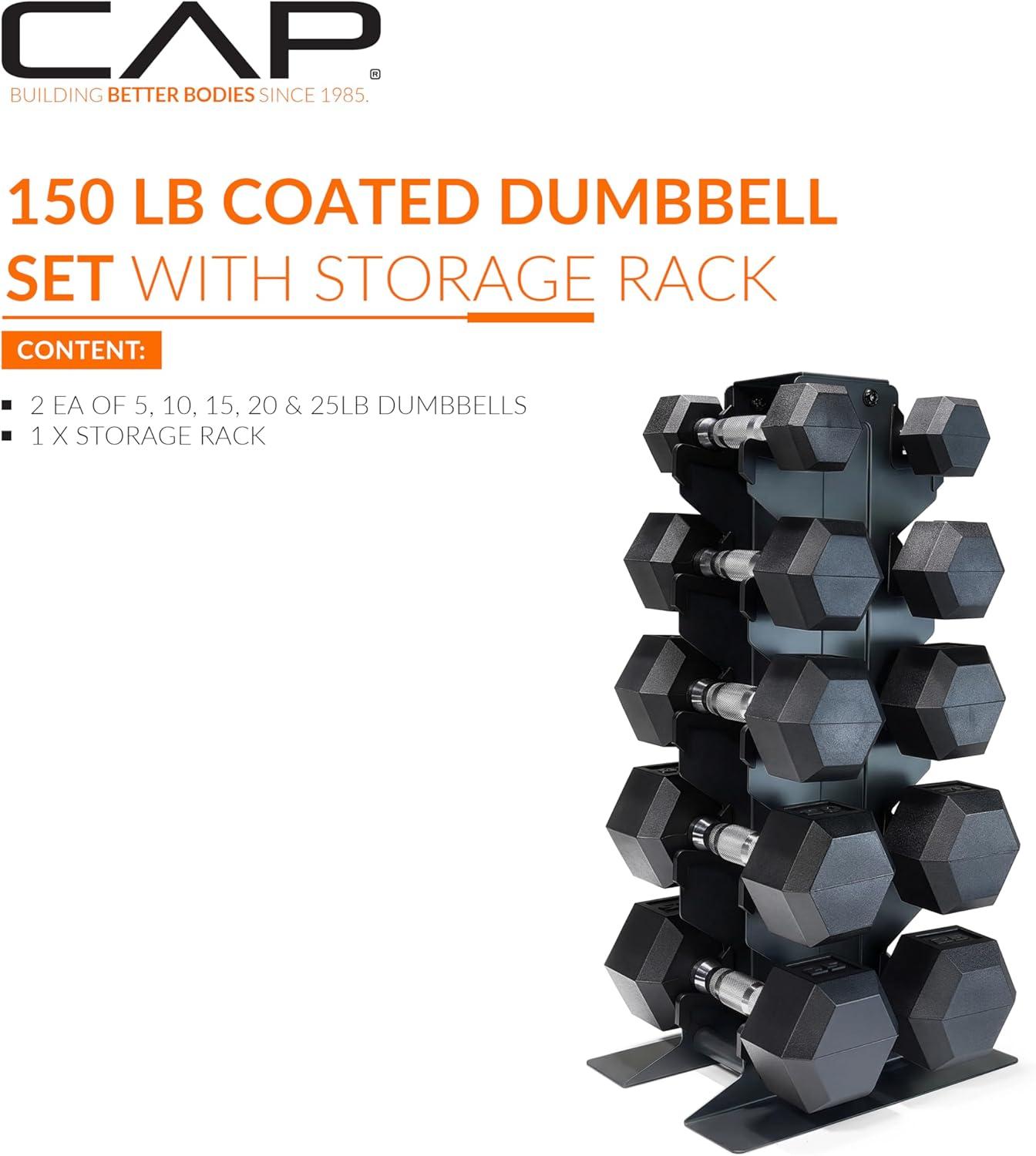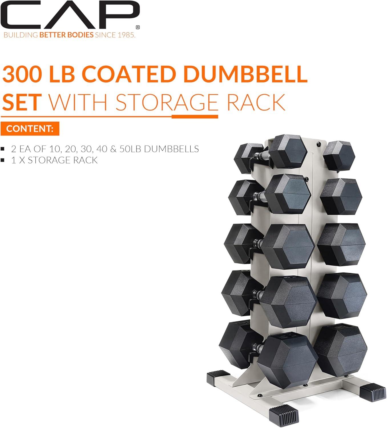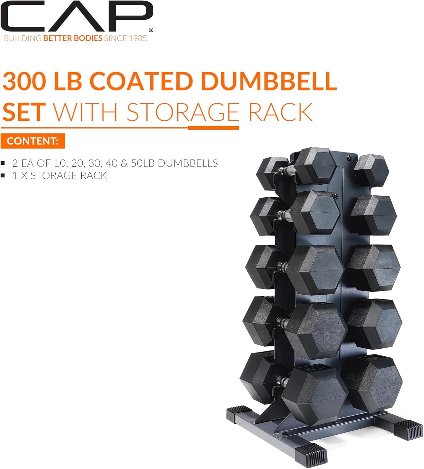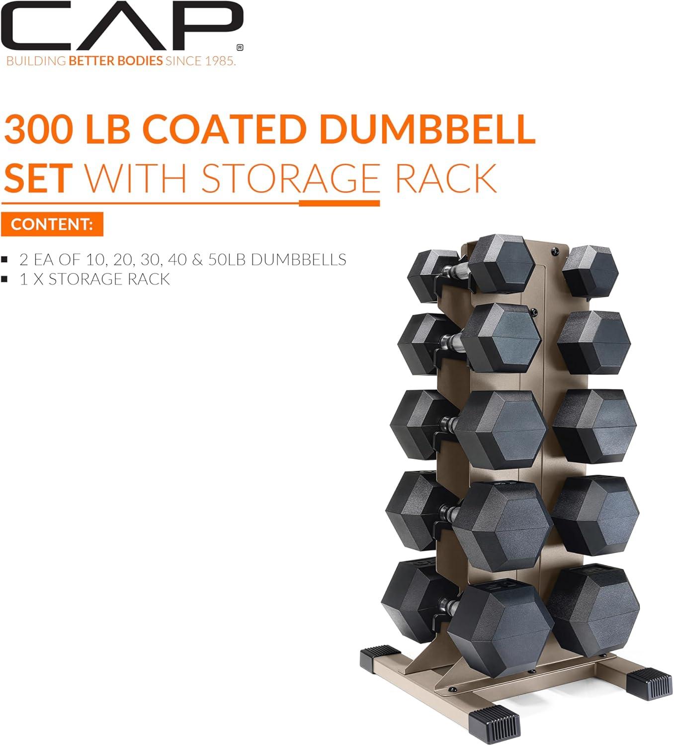 CAP Barbell Rubber Coated Hex Dumbbell Set with Vertical Rack | 100-300 lbs Free Weights Dumbbells Set for Home Gym | Multiple Options(Comfort Handle)