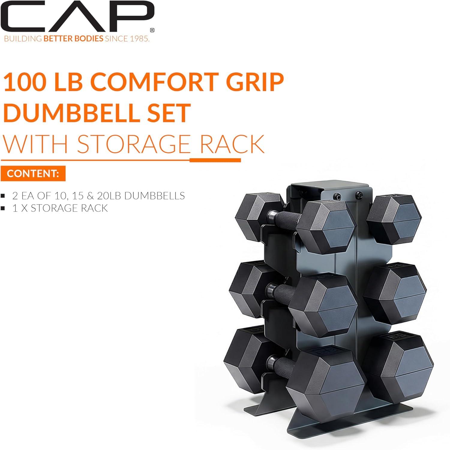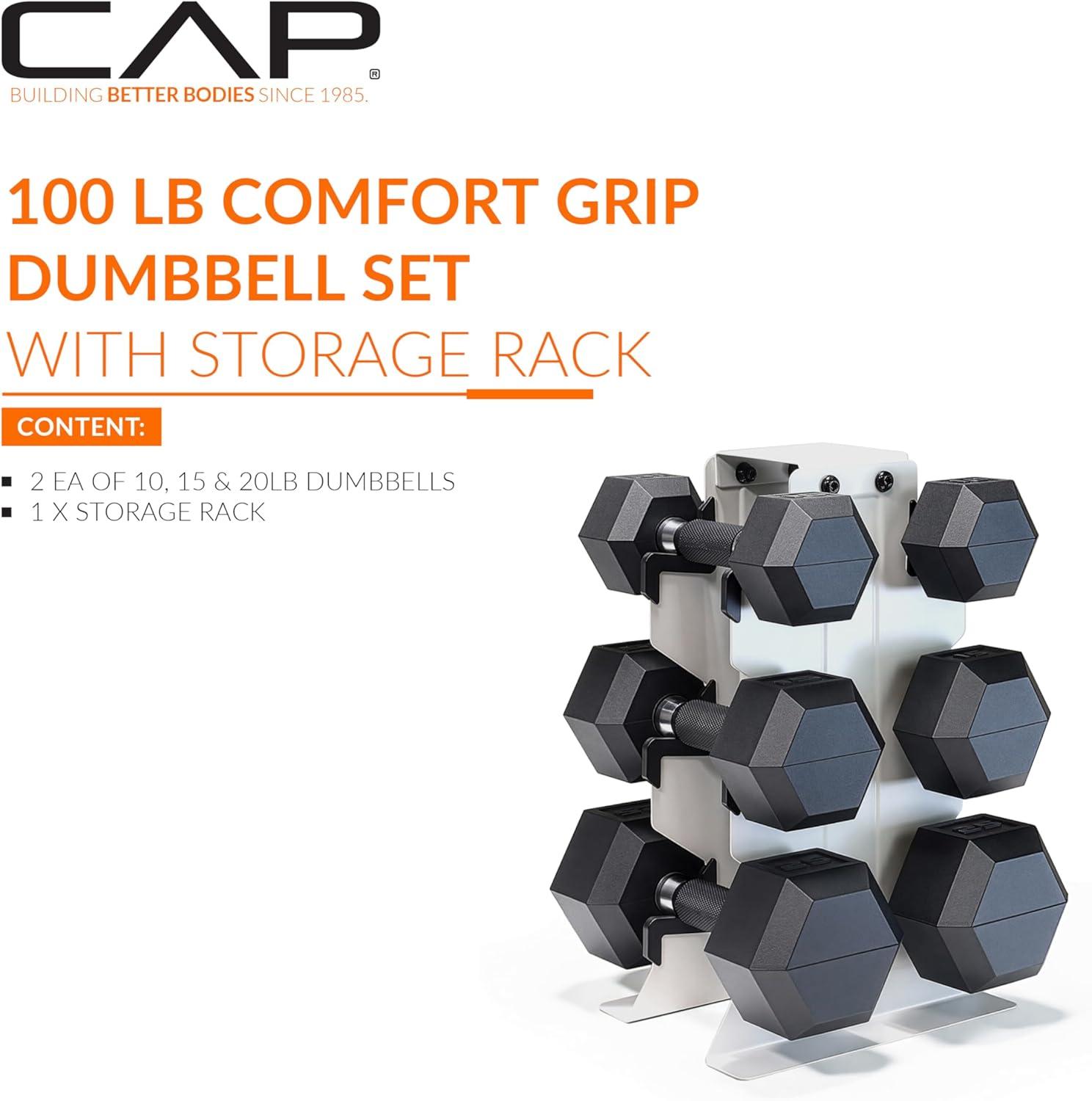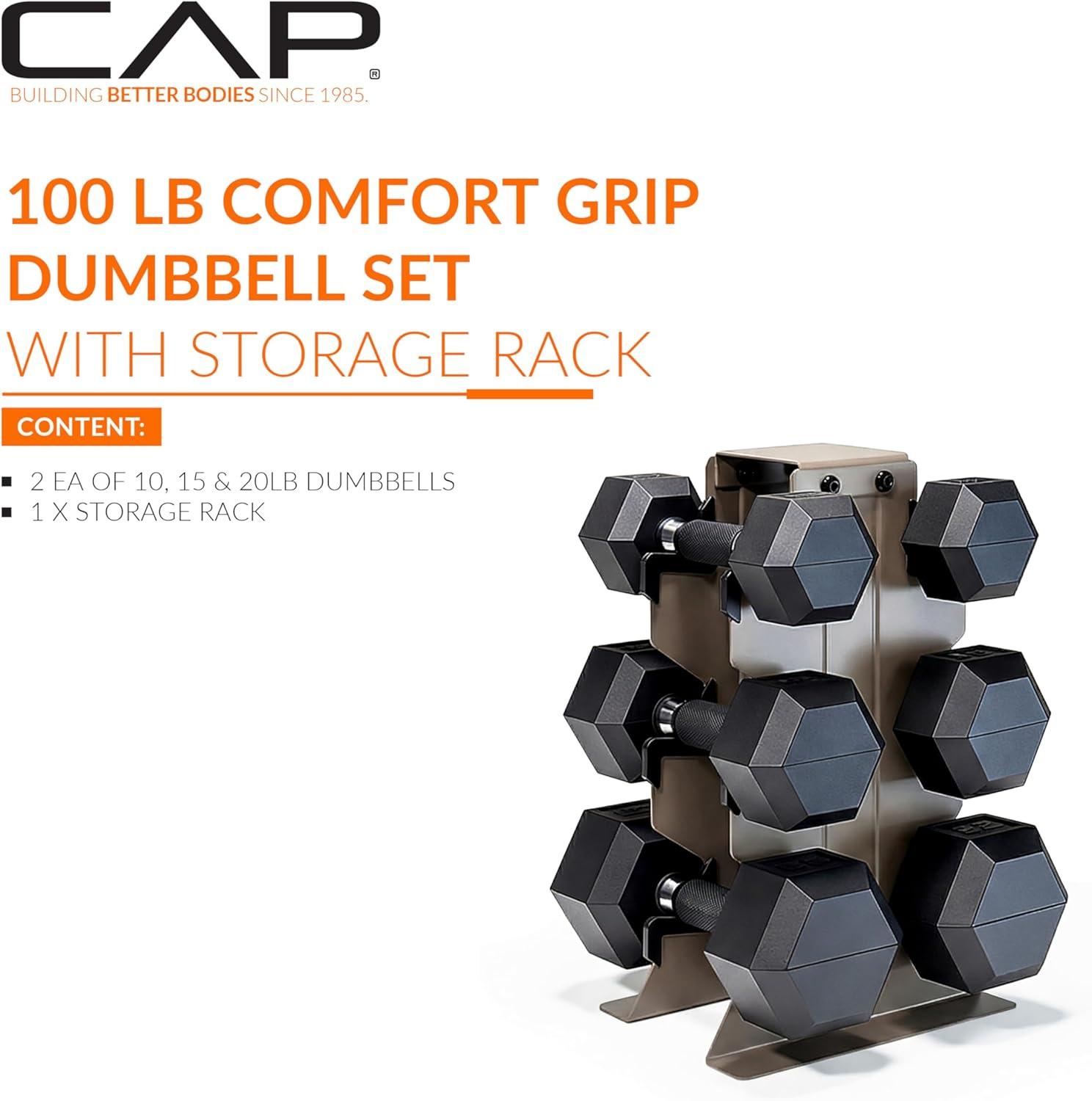 imageCAP Barbell Rubber Coated Hex Dumbbell Set with Vertical Rack  100300 lbs Free Weights Dumbbells Set for Home Gym  Multiple OptionsComfort Handle