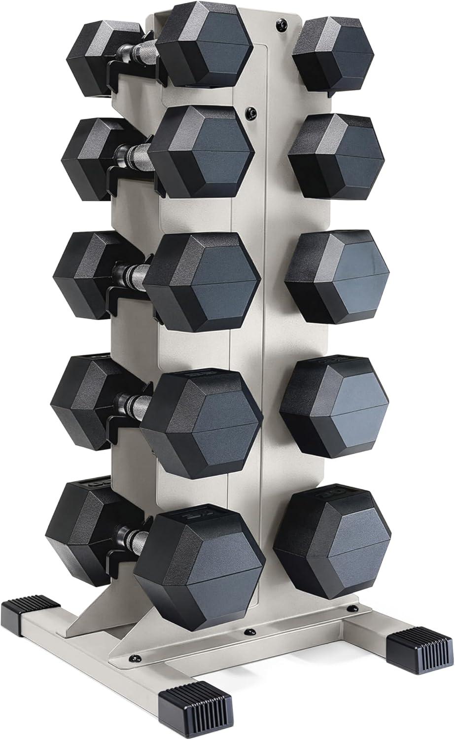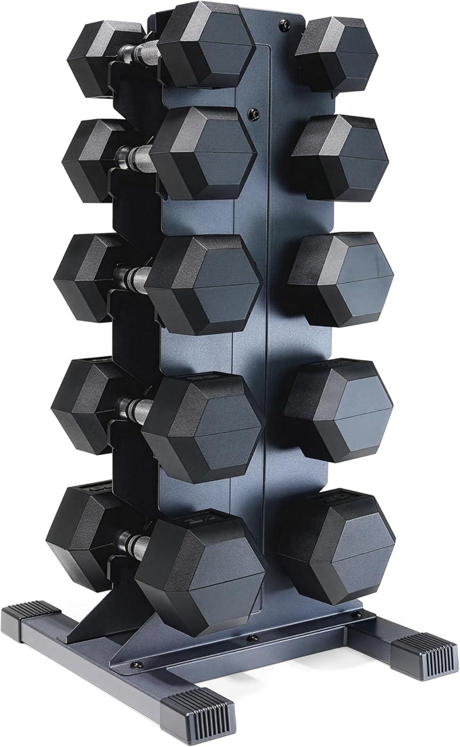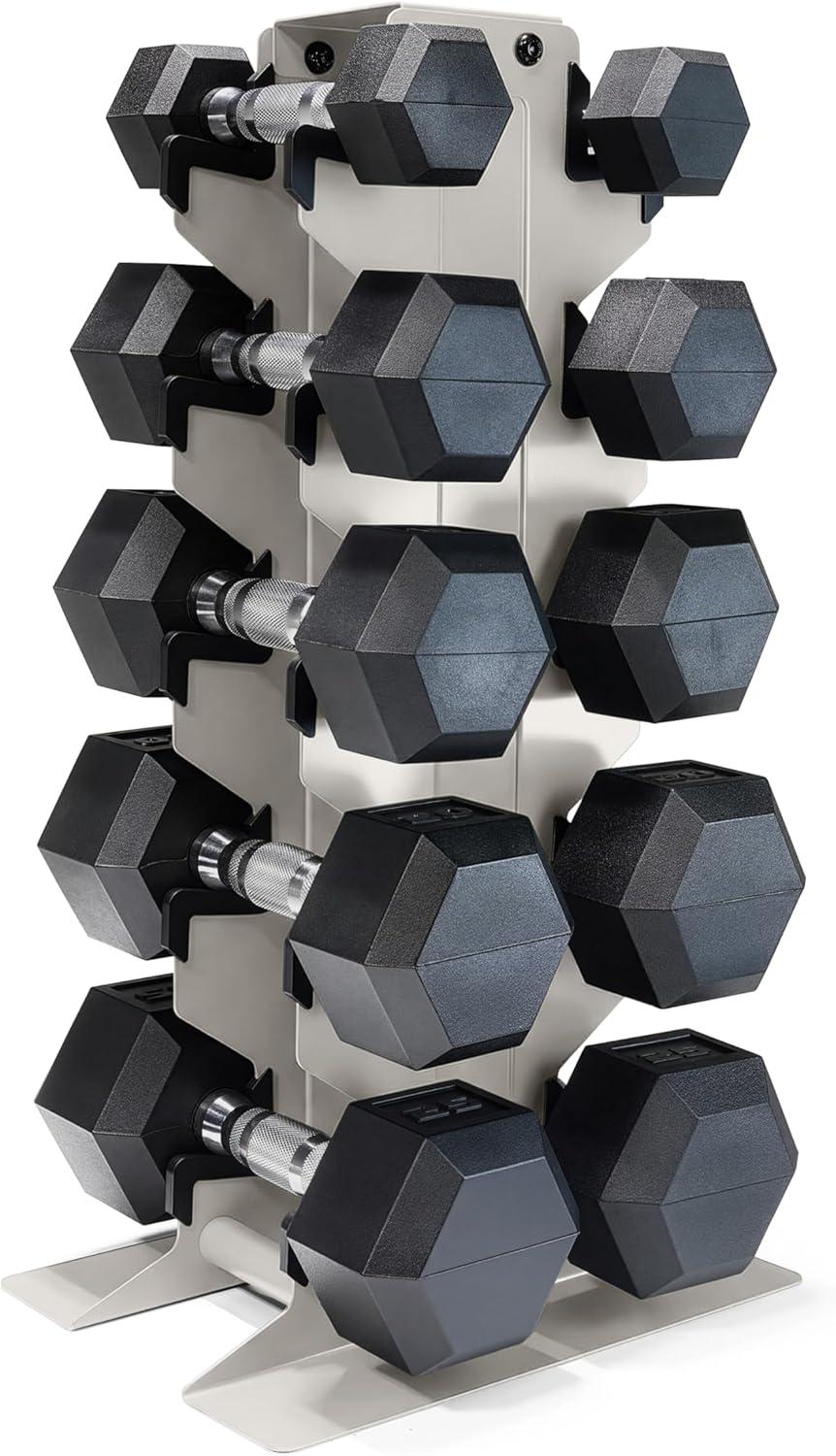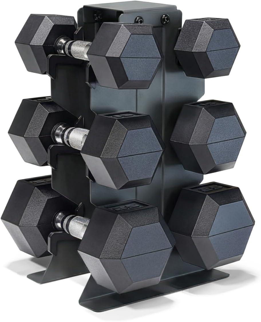 COMPLETE DUMBBELL SET WITH RACK – Includes A pair of 5-pound, 10-pound, 15-pound, 20-pound, 25-pound and 30-pound black handle rubber hex dumbbells with a vertical dumbbell rack to store the weights. This complete free weights dumbbell set is designed for home gym and garage gym use. NOTE: Ships in multiple boxes for faster and safer delivery; boxes may arrive separately.
