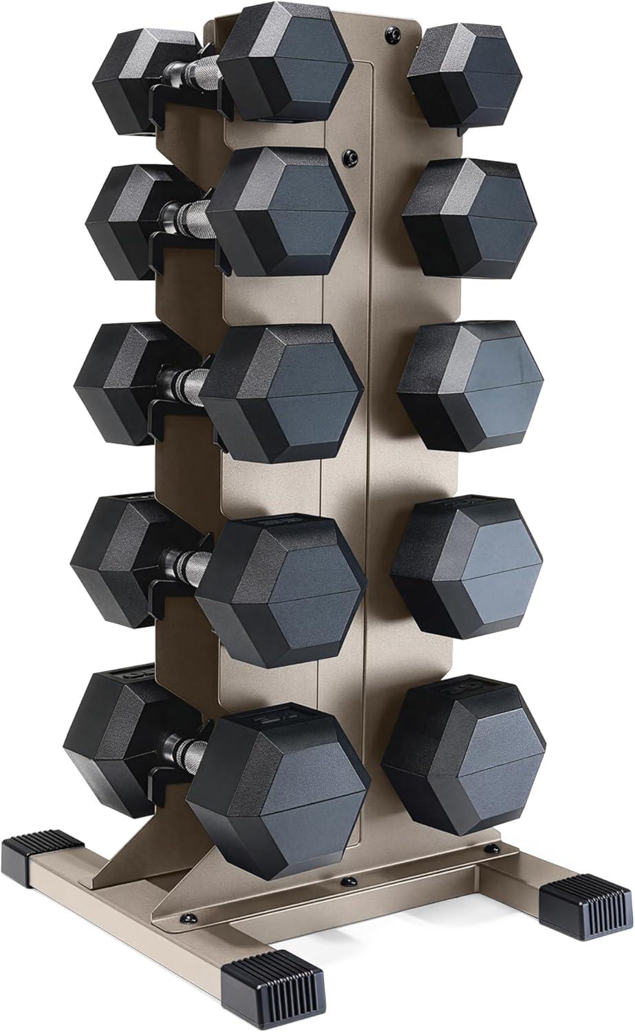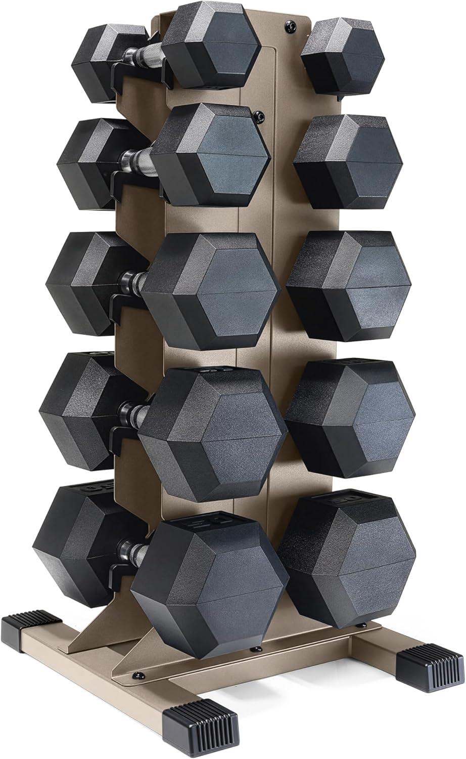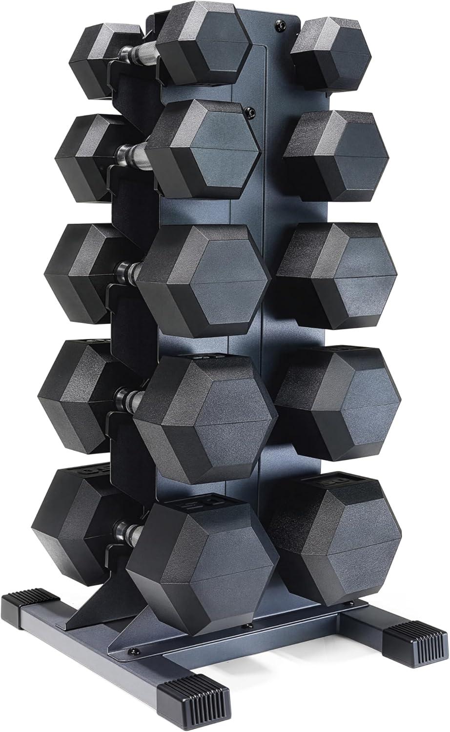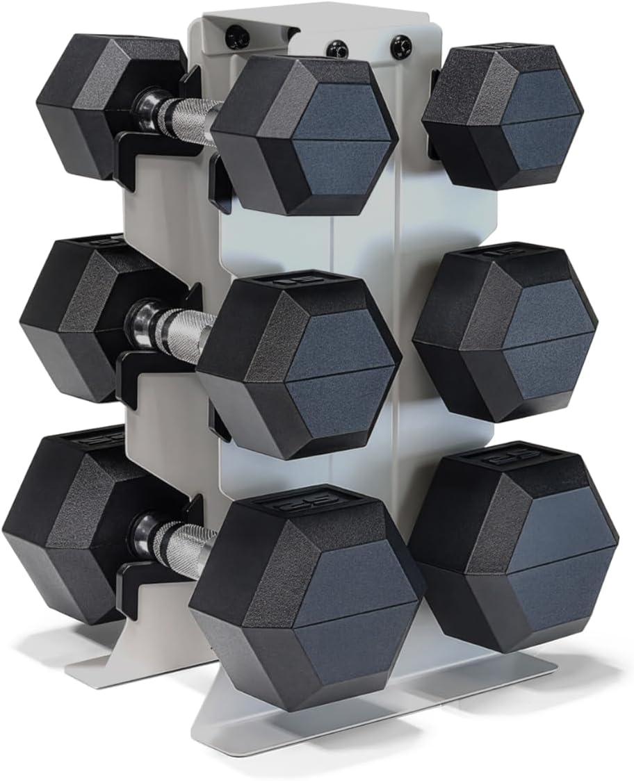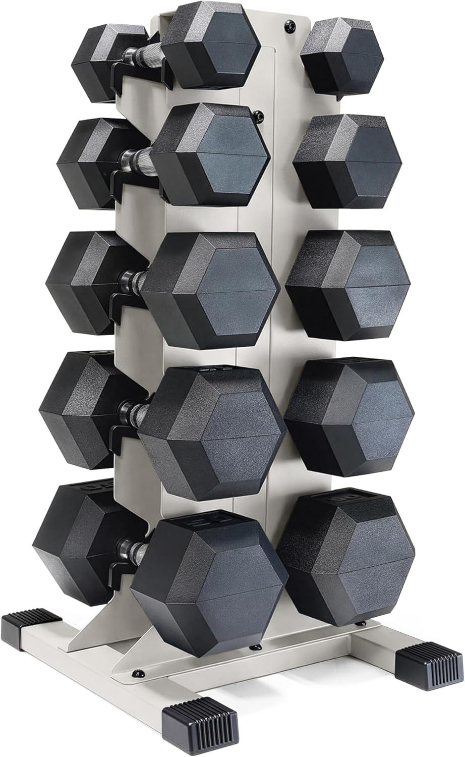 COMPLETE DUMBBELL SET WITH RACK – Includes A pair of 5-pound, 10-pound, 15-pound, 20-pound, 25-pound and 30-pound black handle rubber hex dumbbells with a vertical dumbbell rack to store the weights. This complete free weights dumbbell set is designed for home gym and garage gym use. NOTE: Ships in multiple boxes for faster and safer delivery; boxes may arrive separately.