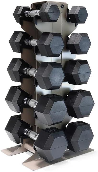 DURABLE CONSTRUCTION – These dumbbell free weights are made from ASTM A48 Class 20 gray iron with an extremely durable rubber coating to help protect floors and reduce noise. Solid 1018 cold-rolled steel handles provide long-lasting performance. Rack is built from steel with a black powder-coat finish with rubber inserts to protect both dumbbells and rack from scratches and wear