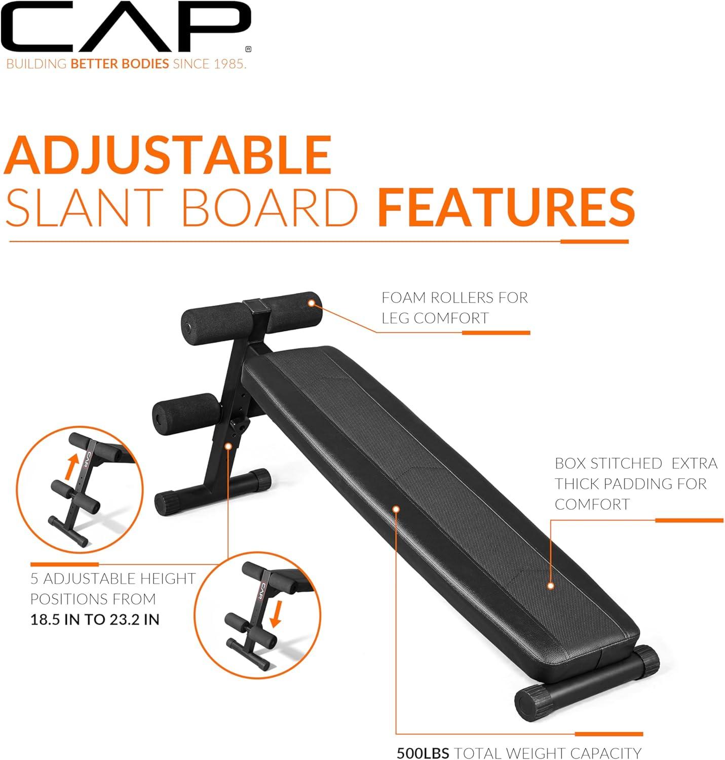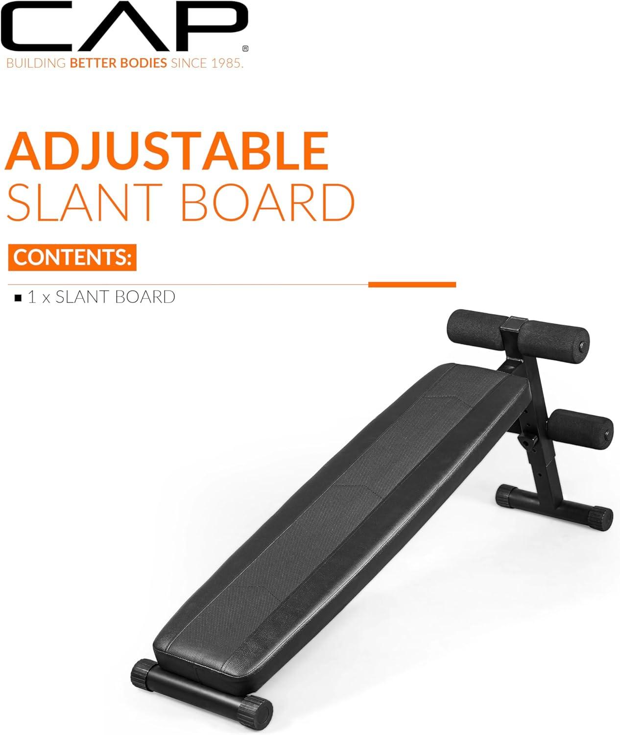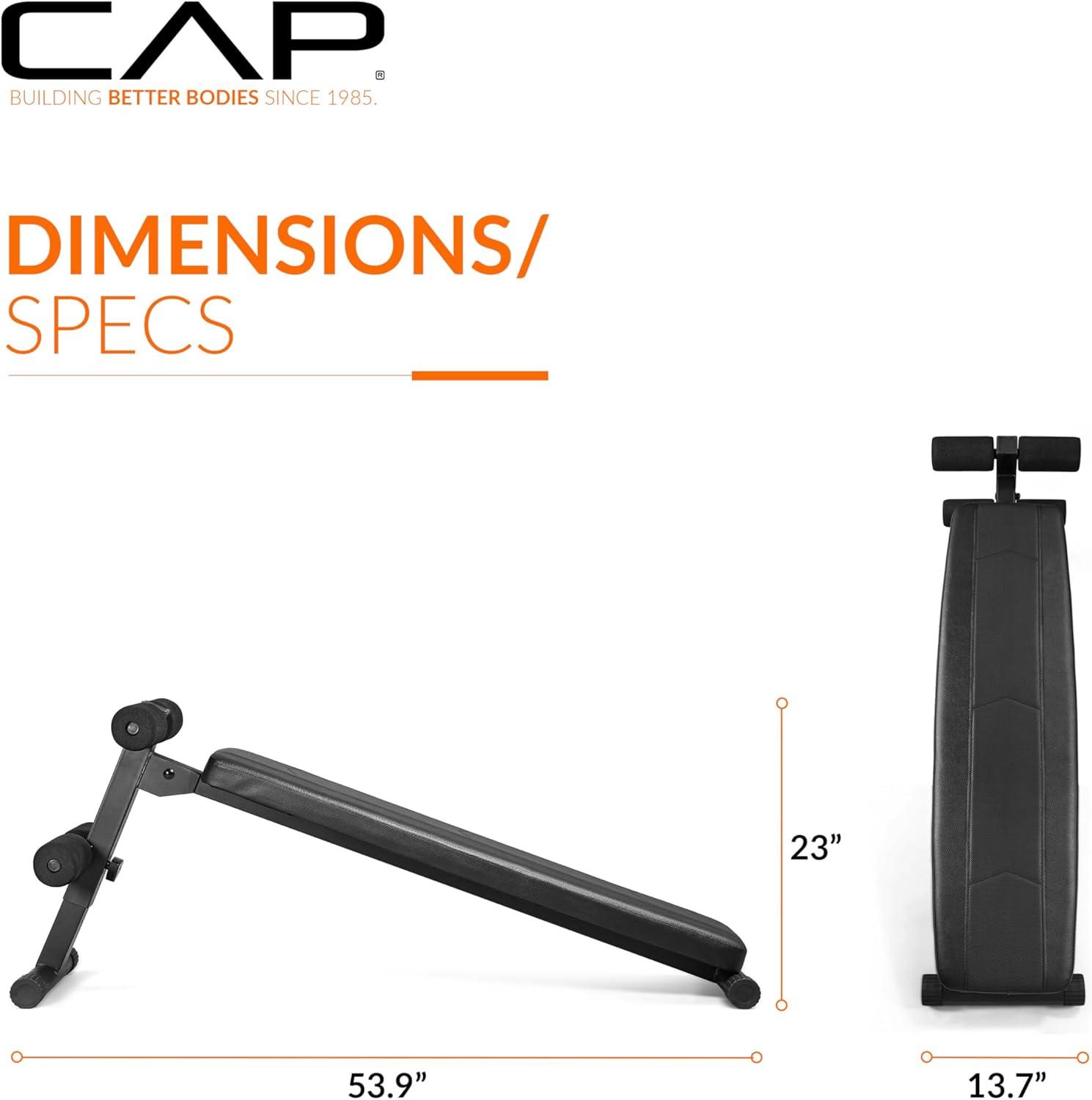 Upgrade your home gym with the CAP Barbell Sit Up Bench, a durable and versatile decline ab bench engineered for effective core and full-body training. Constructed from heavy-duty steel, this adjustable decline sit up bench provides exceptional stability and support, allowing you to focus on form, balance, and muscle activation.Perfect for sit-ups, crunches, leg raises, and strength training, this multi-purpose slant board helps tone abs, strengthen the core, and improve posture. The adjustable incline allows you to vary resistance levels, making it ideal for beginners and experienced athletes alike.The compact, space-saving design makes it an excellent addition to any home gym setup, providing quality performance without taking up too much room. Soft, high-density padding and ergonomic construction ensure comfort and security during each workout session.Whether your goal is to build muscle, enhance core strength, or improve endurance, the CAP Barbell Decline Sit Up Bench delivers a reliable, high-performance solution for full-body fitness.