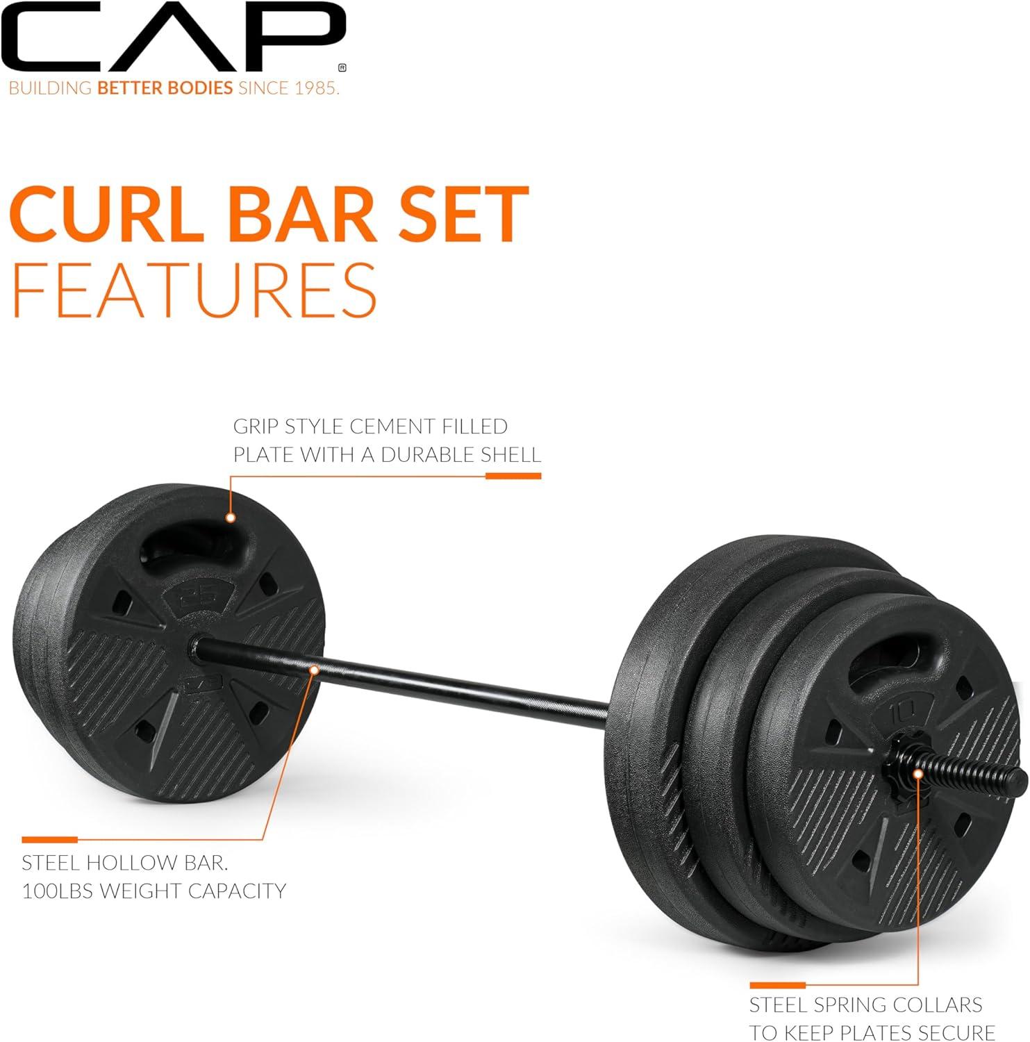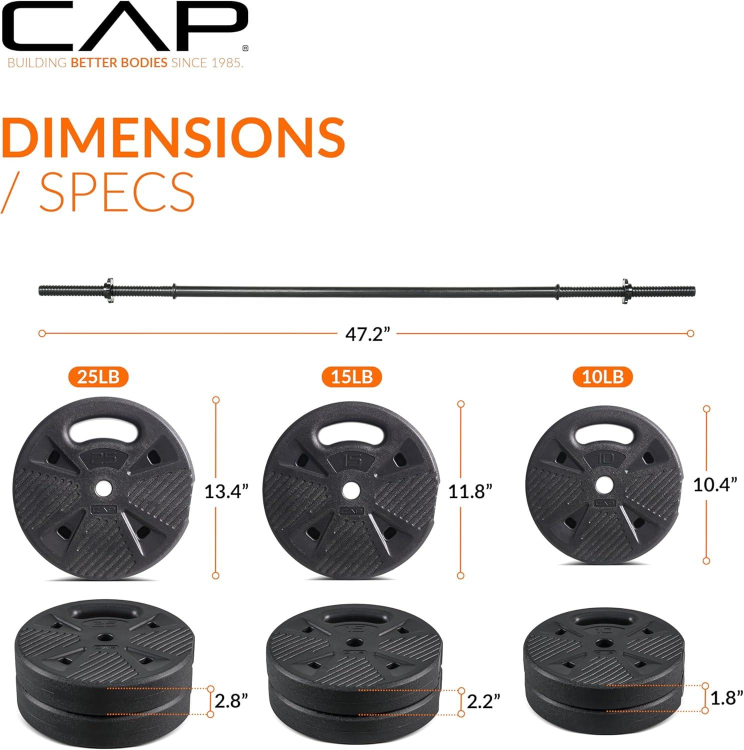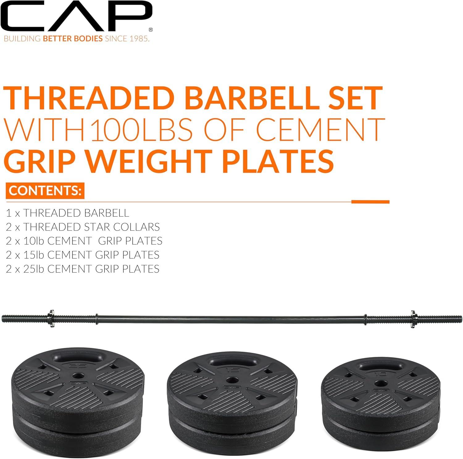 Upgrade your home gym with the CAP Barbell 100 LB Threaded Barbell Set, featuring a 47.2-inch threaded bar and durable cement-filled grip plates. This set includes pairs of 10LB, 15LB, and 25LB grip-style plates with a protective outer shell to withstand repeated use. The threaded bar and star collars keep plates secure, providing a stable and safe lifting experience. Ideal for full-body training, weightlifting beginners, and home fitness routines looking for high-value, space-efficient equipment.