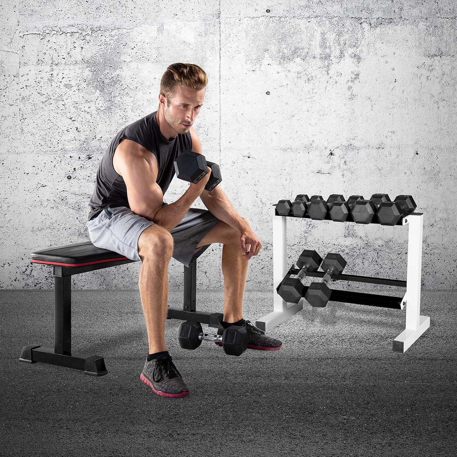 COMPACT DESIGN – This dumbbell rack features a compact two-tier storage space. A flat top rack and a precision angled lower rack allow easy access to dumbbells.