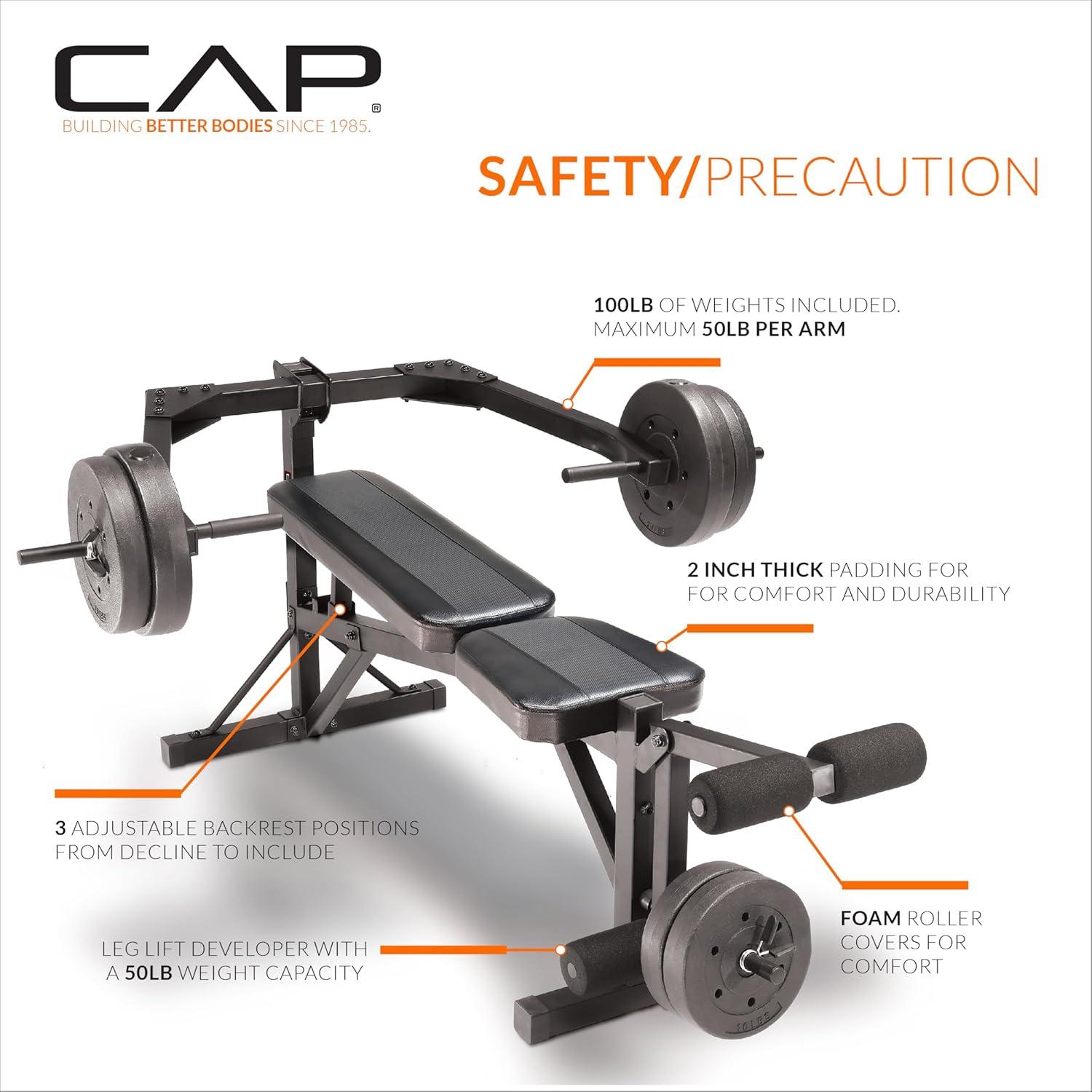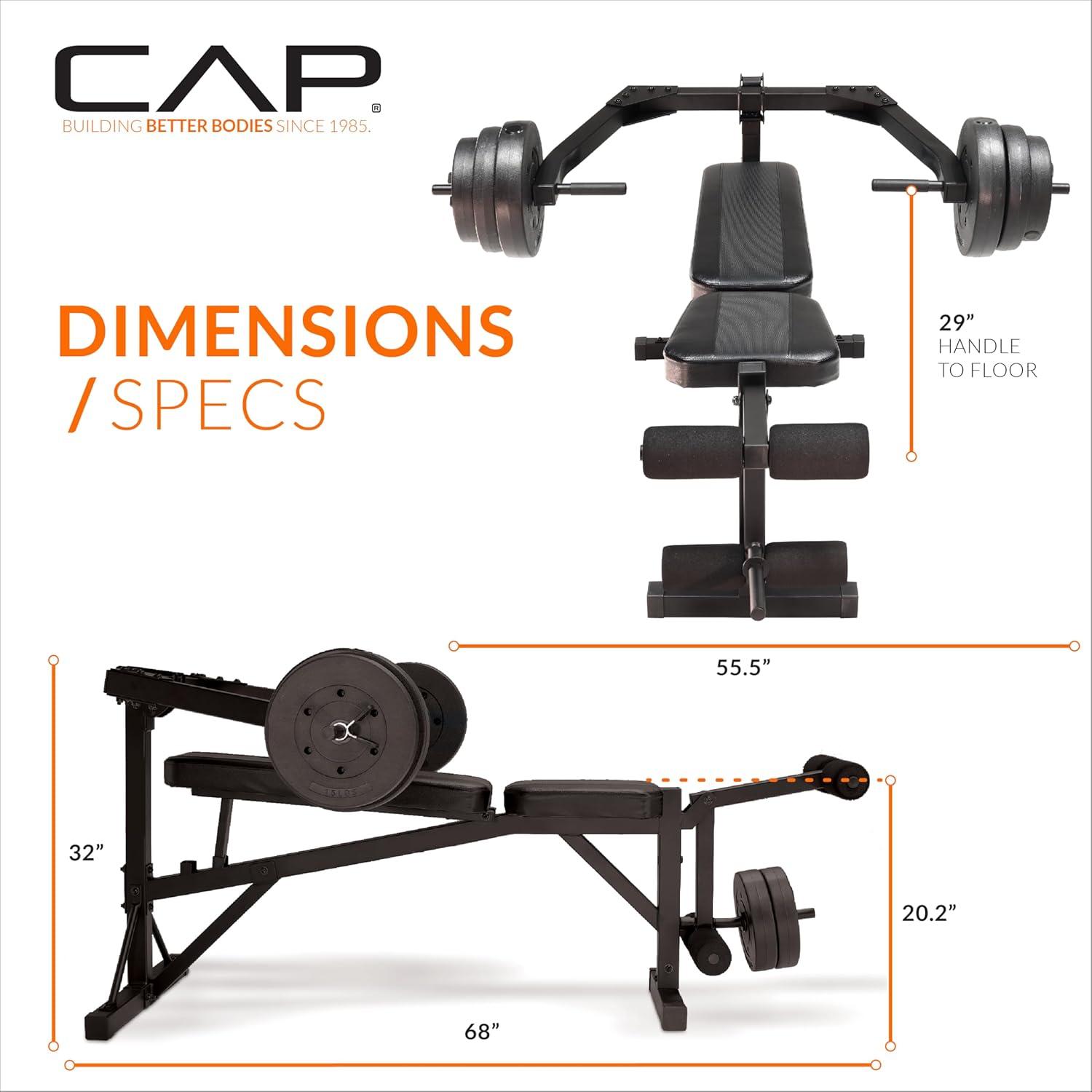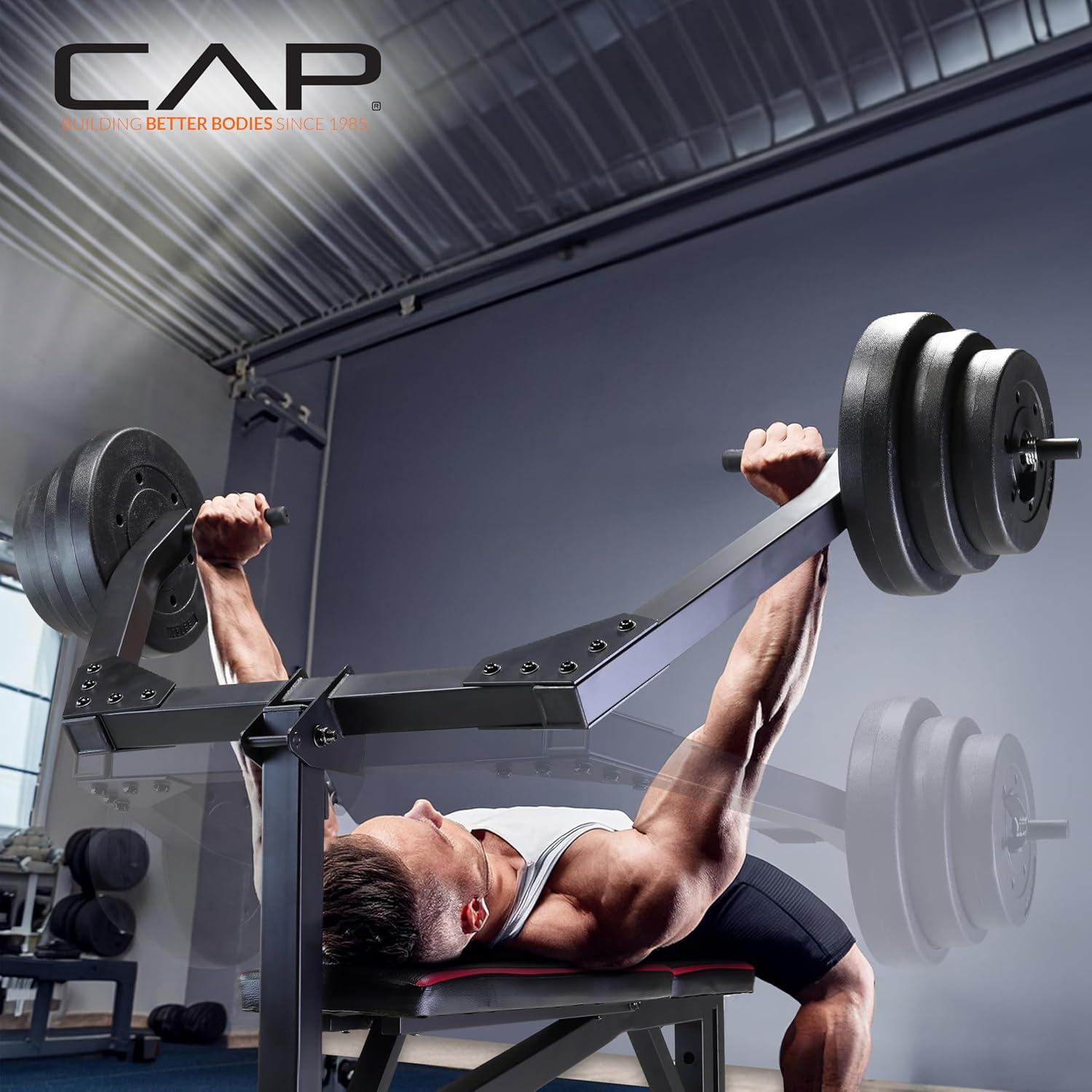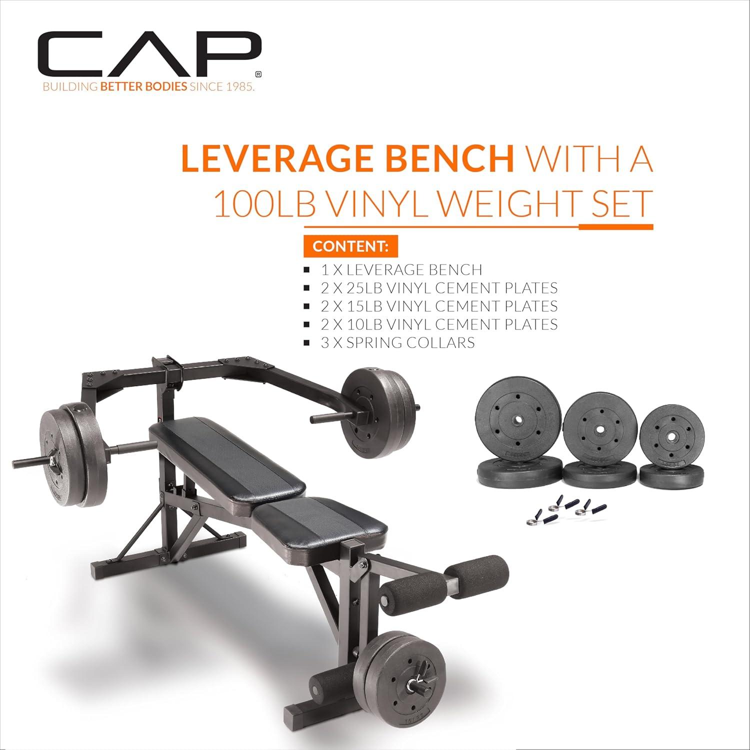 Transform your home gym with the CAP Leverage Weight Bench bundled with a 100 LB Vinyl Cement Weight Set—engineered for safe, controlled, and effective strength training. This multi-position bench provides decline, flat, and incline options to target multiple muscle groups, while the leverage press arms allow you to lift with smooth, stable motion. The included vinyl cement weight plates make it easy to progress your workouts, and the built-in leg developer adds lower-body training versatility. Whether you're building muscle, toning, or starting a new fitness journey, this bench delivers durability, comfort, and performance for all fitness levels.