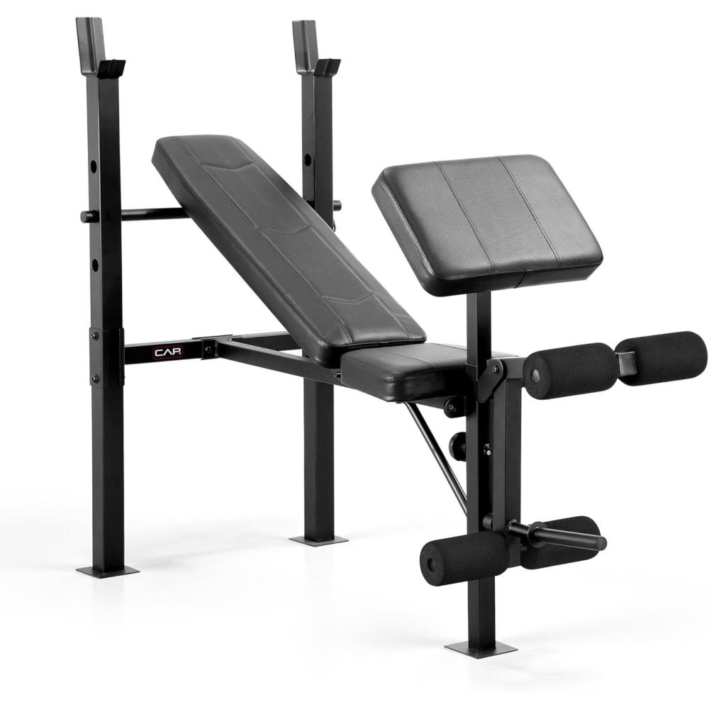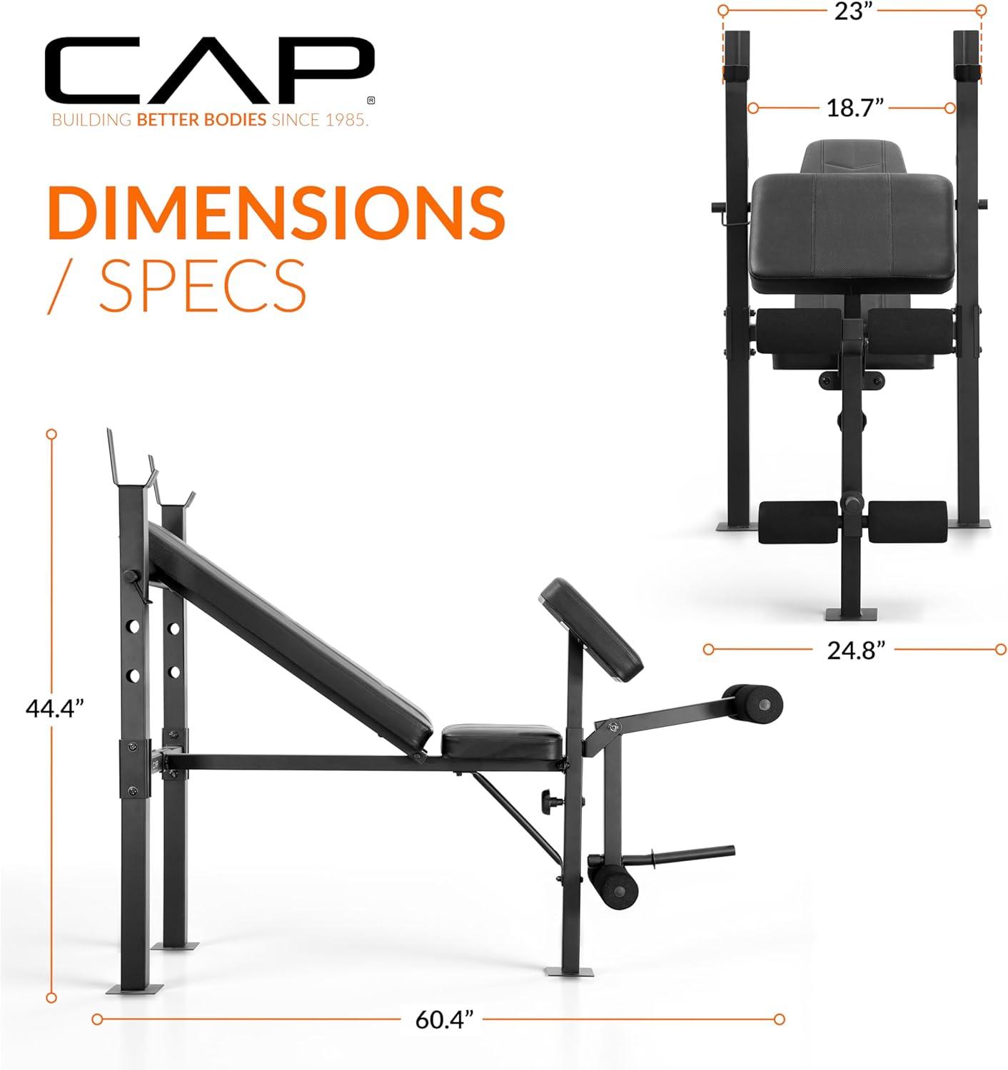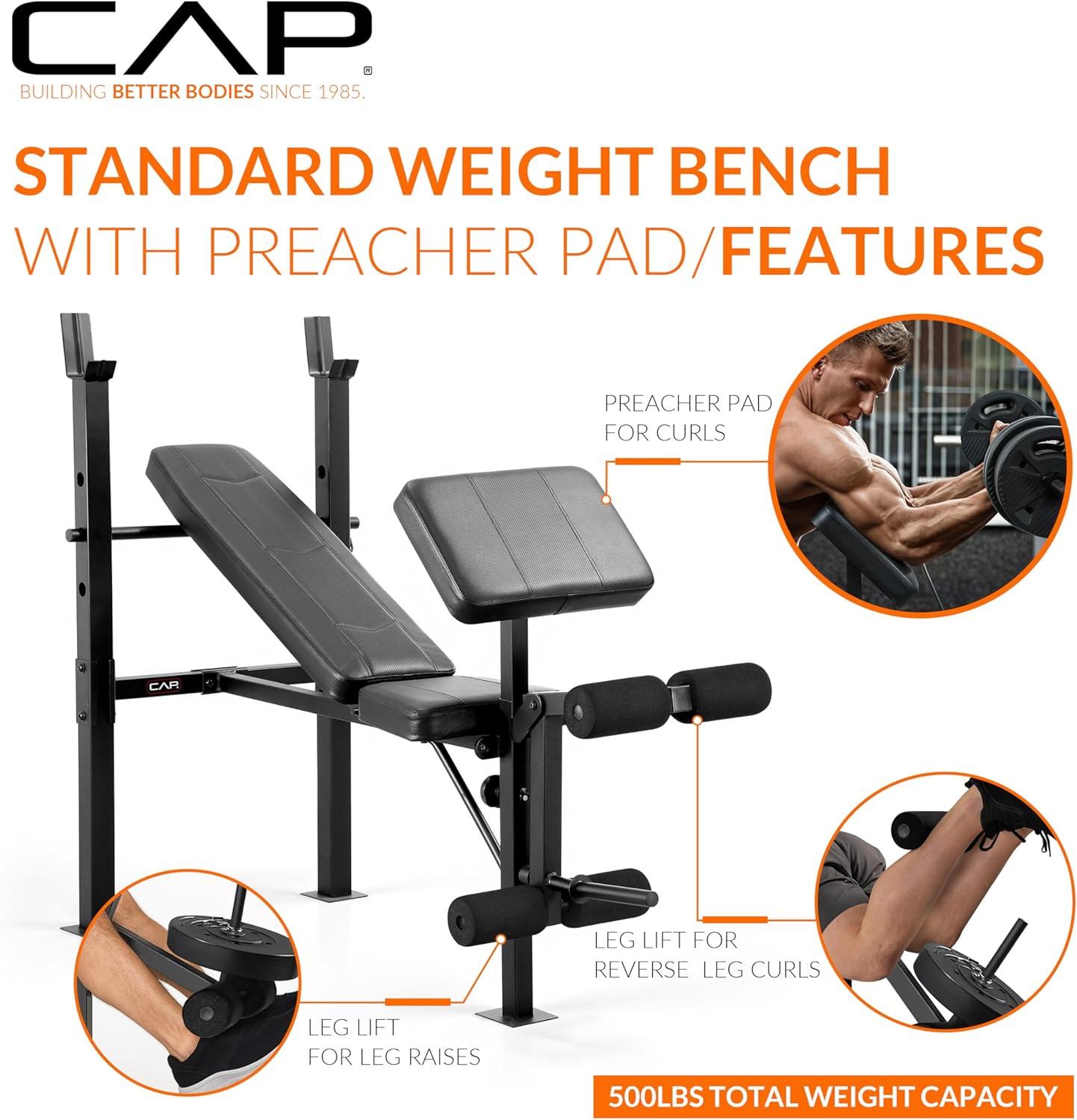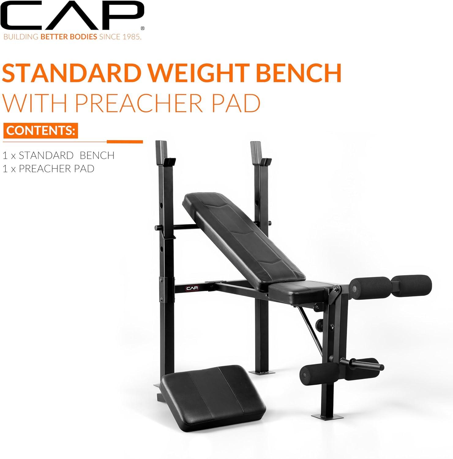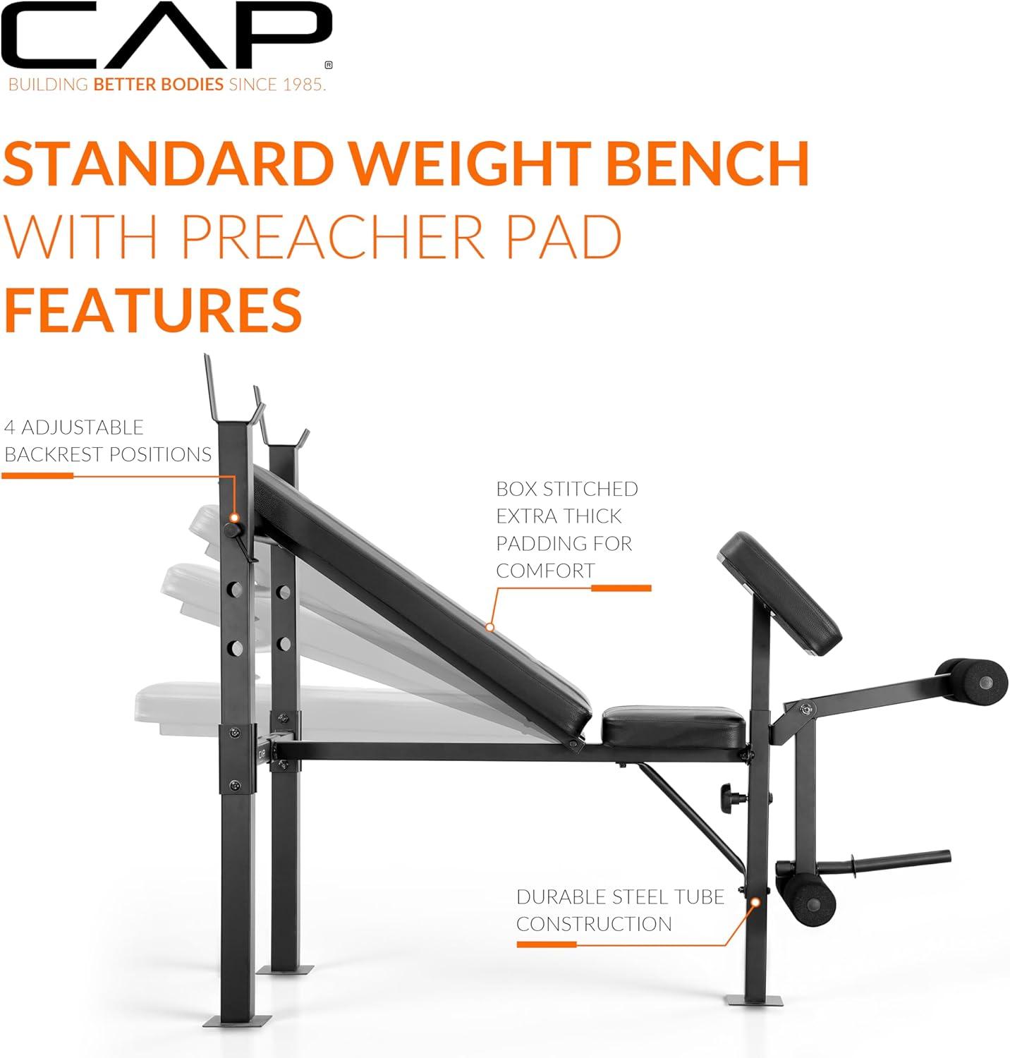 Unlock full-body strength training at home with the CAP Standard Weight Bench with Preacher Pad, designed for lifters seeking versatility, comfort, and durability. This multifunctional bench features 4 adjustable backrest positions, allowing incline, flat, and decline exercises for chest, shoulders, back, and arms. The built-in preacher pad provides stable arm isolation for bicep curls, while the leg developer supports leg curls and leg raises.Constructed with heavy-duty steel tubing and extra-thick box-stitched padding, this bench delivers long-lasting support with a 500 LB total weight capacity. Ideal for small home gyms, beginners, intermediate lifters, or anyone looking to expand their weight-training setup.Perfect for bench presses, dumbbell workouts, preacher curls, leg extensions, strength training, and full-body home workouts.